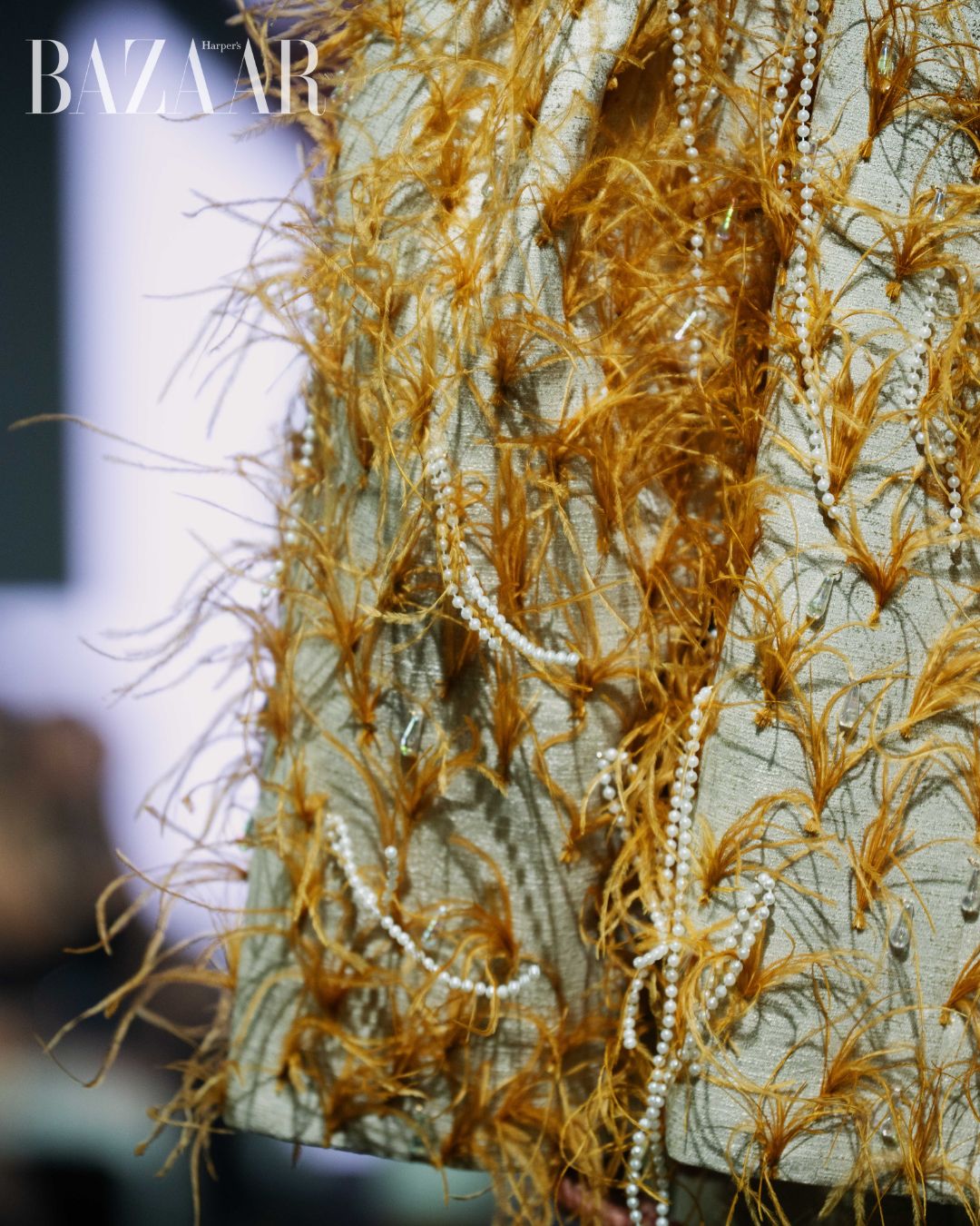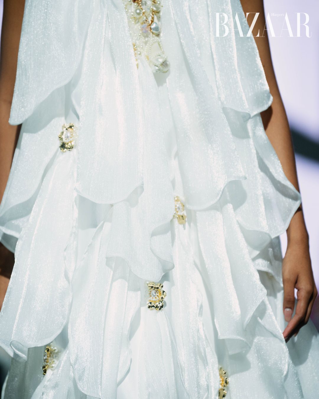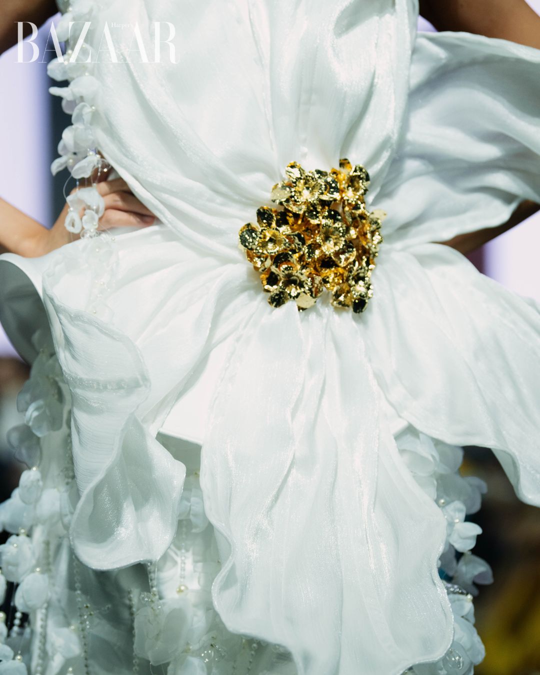 Mỗi bộ cánh gửi xuống đồng thời là một công trình sống bảo chứng cho kỹ nghệ thủ công của Tangoo: Chi tiết trang trí vàng điêu khắc, trang trí ngọc trai, pha lê theo bố cục đối xứng trên áo bustier, thêu mảng màu khéo biến trang phục thành tác phẩm hội hoạ. Venus Ascendant của Tangoo có những thiết kế khiến bạn trầm trồ khi nhìn tổng thể, và càng choáng ngợp hơn nữa khi khai phá mỗi chi tiết.