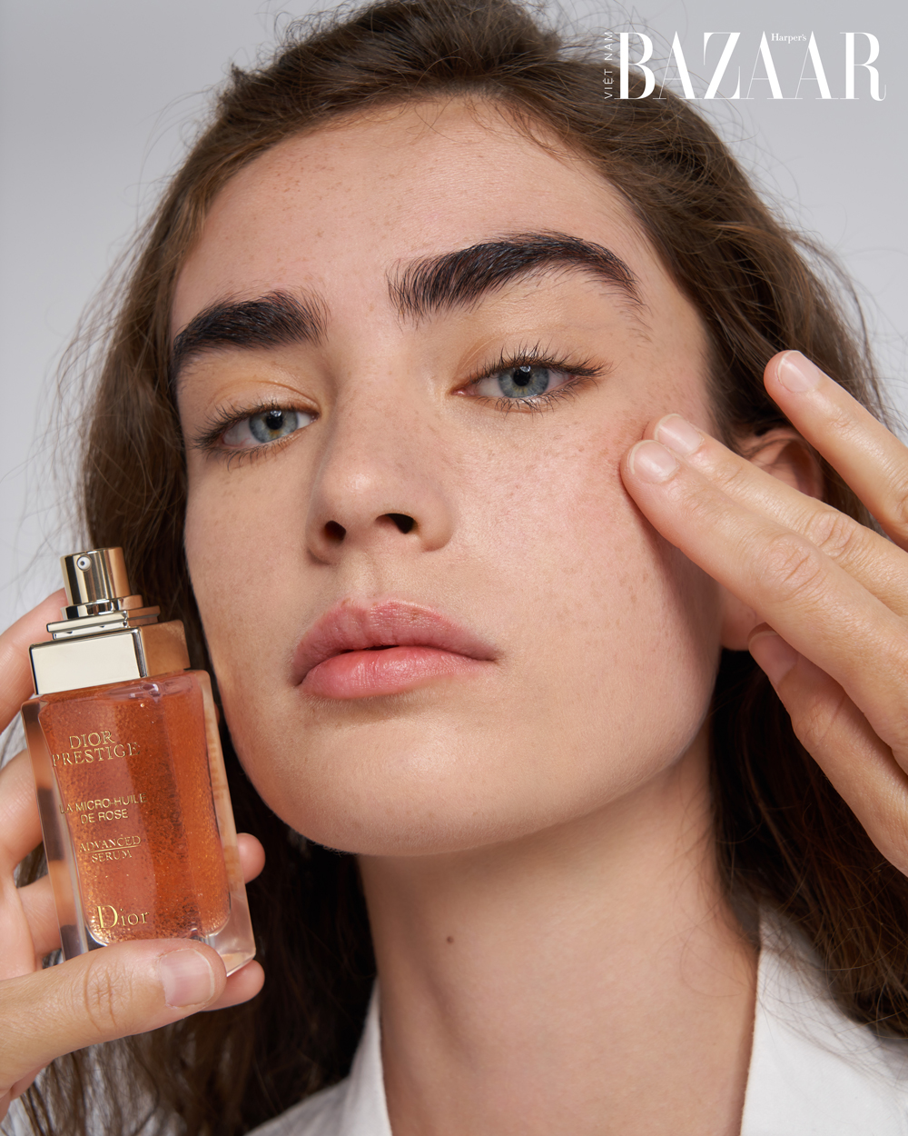 “Để có một làn da tỏa sáng và tự nhiên, trước hết, tôi thực hiện chu trình dưỡng da Dior Prestige với sữa dưỡng da Micro-Lotion De Rose. Sau đó thoa tinh chất Micro-Sérum De Rose Yeux.