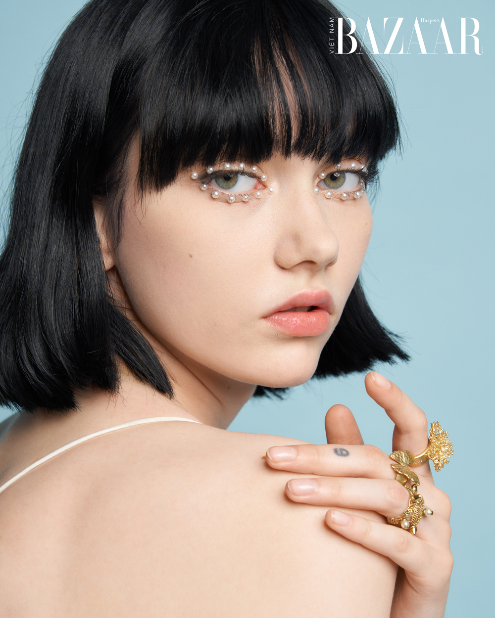 Sau đó, tôi sẽ đính thêm ngọc trai lên mi mắt. Có thể viền hết mắt, hoặc đặt một viên ở góc trong và góc ngoài khóe mắt. Thậm chí chỉ cần một viên duy nhất tại góc trong của mắt. Những viên ngọc này được thêm vào một cách tinh tế, mang đến nét tỏa sáng đáng kinh ngạc.
