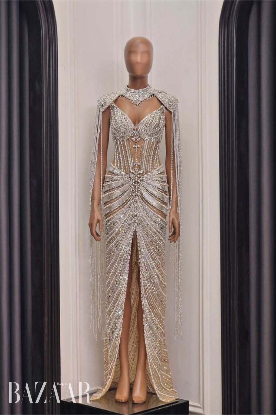 Mô-típ trang trí lấp lánh trên trang phục cùng phom dáng rất tương đồng với thiết kế đã được xướng tên cùng Mook cho vai trò Á hậu Miss Cosmo 2024 hơn một năm trước đây. Điểm khác biệt nằm ở chi tiết vai áo choàng, nhấn mạnh thêm sự quyền lực, trưởng thành của người đẹp.