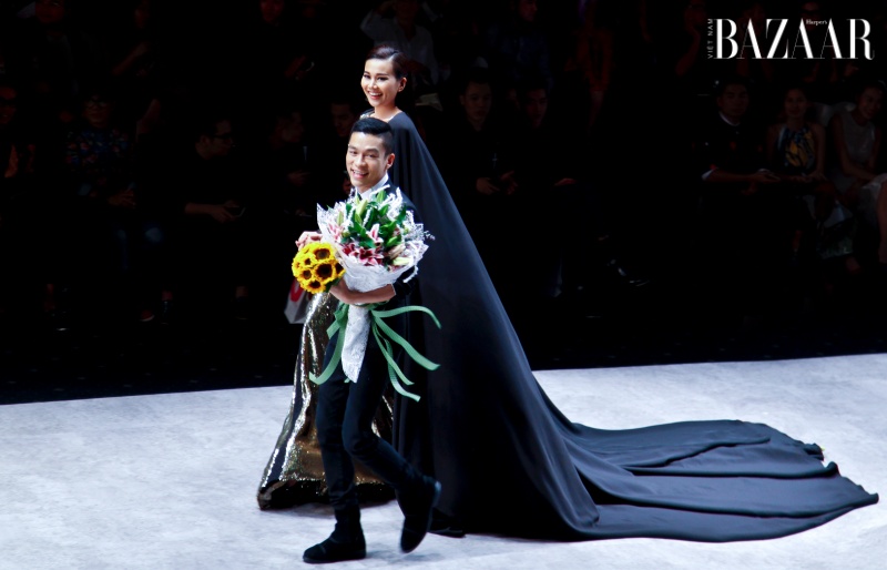 Adrian Anh Tuấn (giữa) cùng siêu mẫu Thanh Hằng, bà Trang lê (phải) trên sàn diễn VIFW