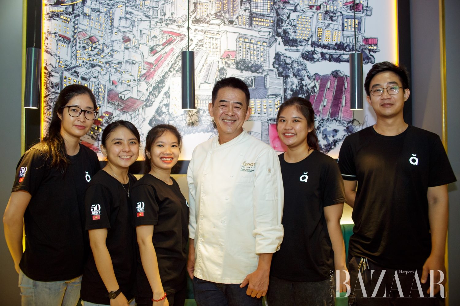 Chef Peter Cường Franklin (áo trắng, giữa) và đội ngũ tại Anan Saigon. Phía sau là bức tranh Saigon Cityscape Panorama.