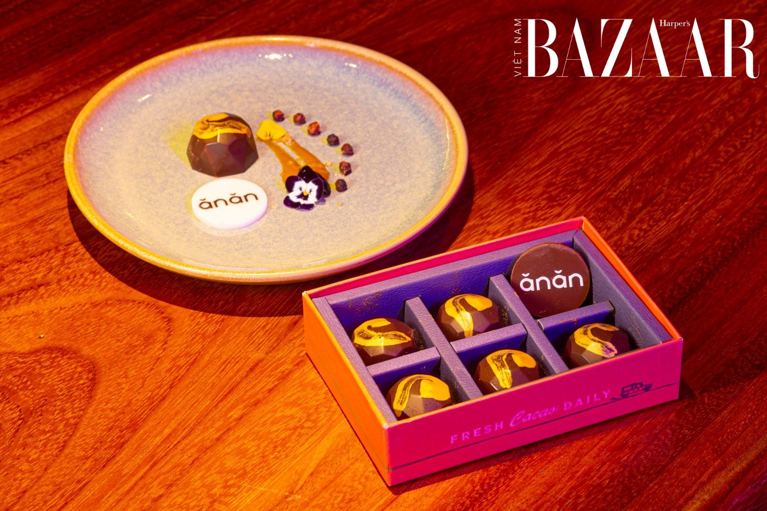 Trong món Nước mắm Bonbon tại Anan Saigon, kẹo chocolate được làm từ ba loại cacao từ Bến Tre, Bà Rịa và Tiền Giang. Khi ăn cả món, bạn sẽ cảm nhận được hỗn hợp của các mùi vị đa dạng. Đó là umami mặn, kẹo ngọt, tiêu cay và đắng.