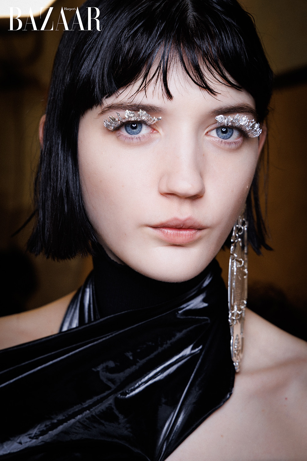 Điểm nổi bật năm nay là phong cách “mắt ánh kim tương lai”, thể hiện qua lớp phấn lấp lánh như kim loại lỏng. Dưới ánh đèn runway, các gam màu ánh kim tạo nên hiệu ứng thị giác mãnh liệt, nâng tầm tổng thể trang phục.