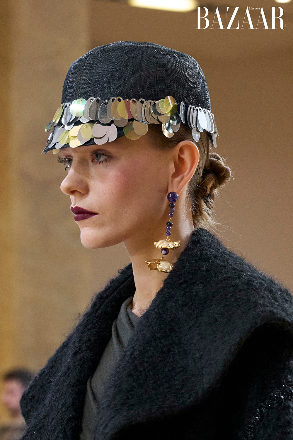Đặc biệt, những chiếc mũ và phụ kiện đầu làm từ kim loại sáng bóng – dây xích, miếng kim loại hoặc đĩa ánh bạc, tạo hiệu ứng phản chiếu bắt mắt, gợi nhắc tới vẻ đẹp vị lai.