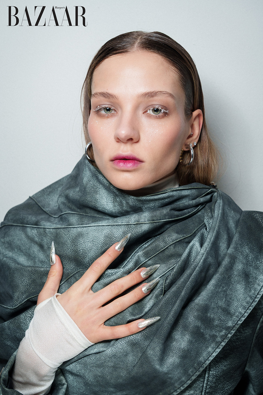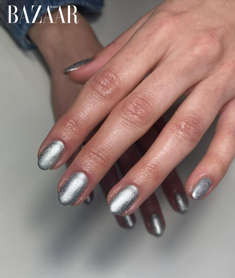 Xu hướng nổi bật nhất mùa Thu Đông 2025 chính là sơn ánh kim phủ trọn ngón tay, mang đến hiệu ứng như thể các người mẫu vừa nhúng tay vào kim loại nóng chảy. Lớp phủ chrome, bạc bóng hoặc vàng ánh gương tạo nên cái nhìn tương lai vô thực, như bước ra từ thế giới khoa học viễn tưởng.
