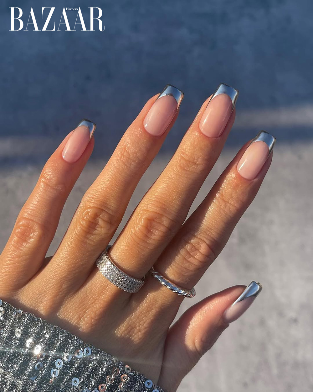 Bên cạnh đó, kiểu sơn móng French metallic cũng quay trở lại, nhưng được làm mới bằng những gam ánh kim như bạch kim, vàng hồng, đồng cháy hay xám súng. Đặc biệt khi kết hợp với dáng móng nhọn hoặc hình hạnh nhân, kiểu nail này tôn bàn tay một cách đầy tinh tế.
