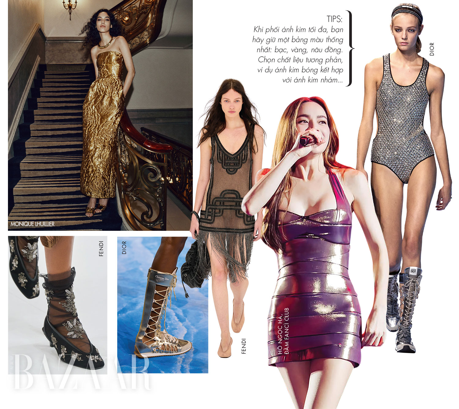 Xu hướng ánh kim tối đa mùa này không dừng lại ở trang phục. Phụ kiện cũng được đẩy lên cao trào: bốt cao cổ, túi clutch gương, khuyên tai bản lớn, giày dép hoặc vớ đính kết tinh xảo. Phong cách trang điểm ánh kim đồng bộ cũng là gợi ý cho bạn.