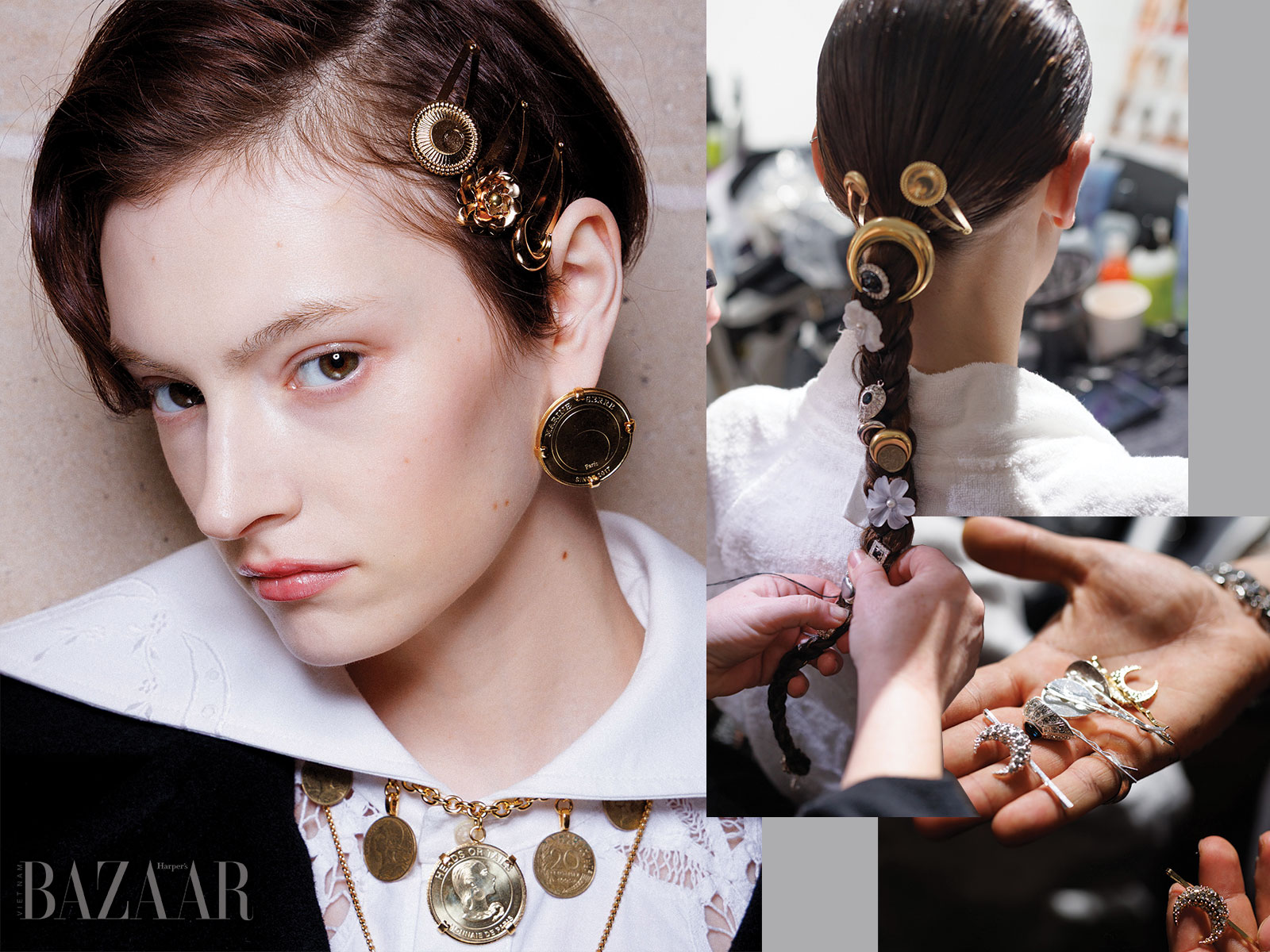 Các sàn diễn Thu Đông 2025 chứng kiến sự trở lại đầy ấn tượng của những món phụ kiện tóc mang đậm cá tính, biến mái tóc trở thành điểm nhấn nghệ thuật cho toàn bộ diện mạo. Những chiếc kẹp tóc không còn chỉ mang tính công năng, mà sử dụng như trang sức, được gắn khắp đầu một cách ngẫu hứng hoặc xếp lớp tạo nên hiệu ứng thị giác táo bạo.