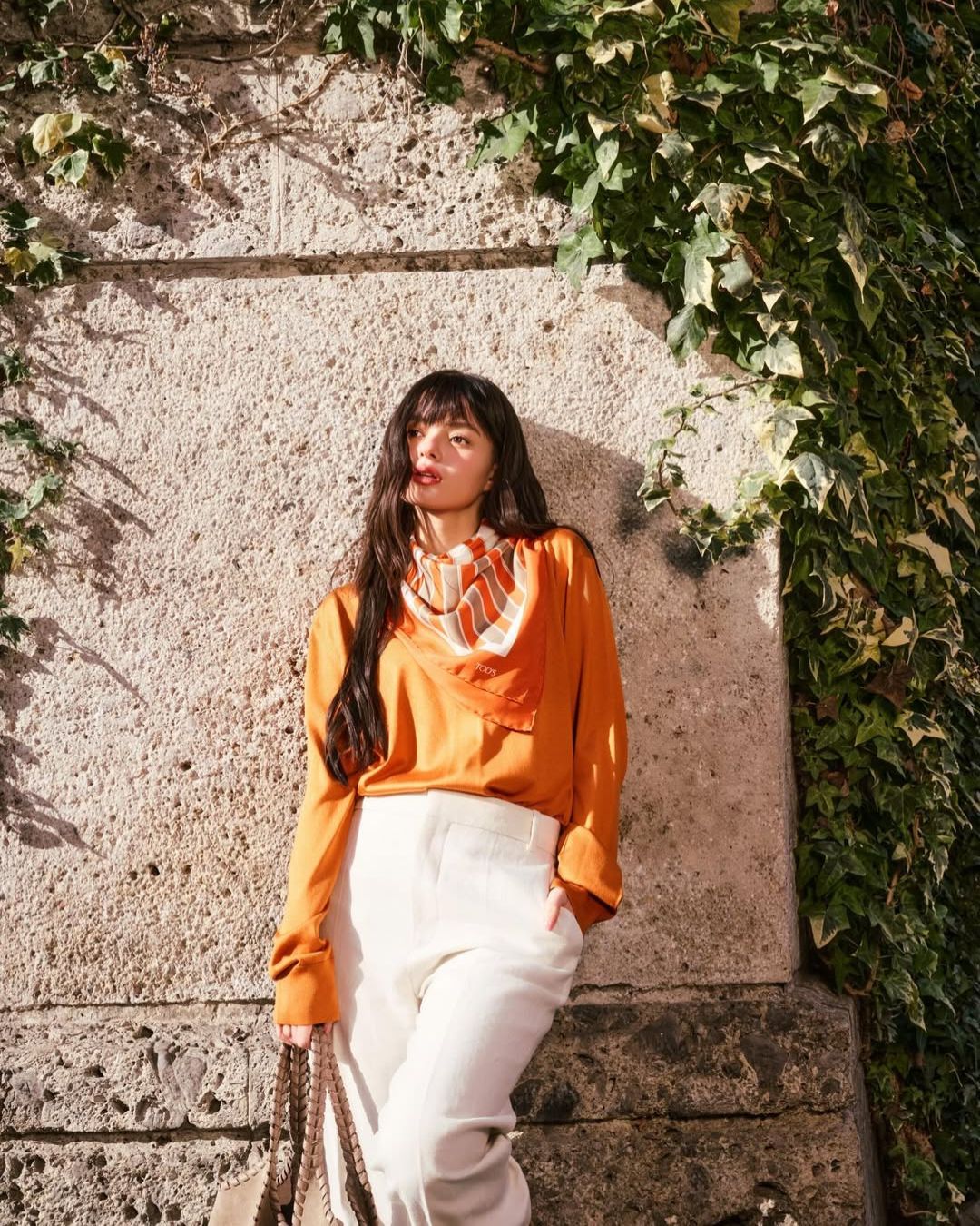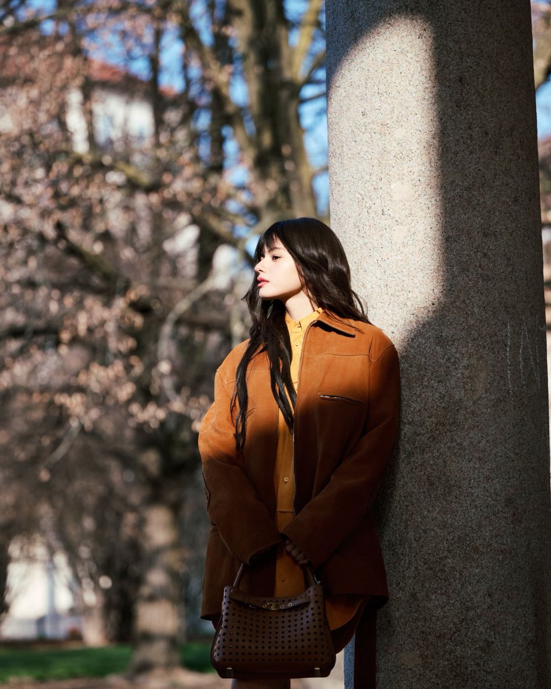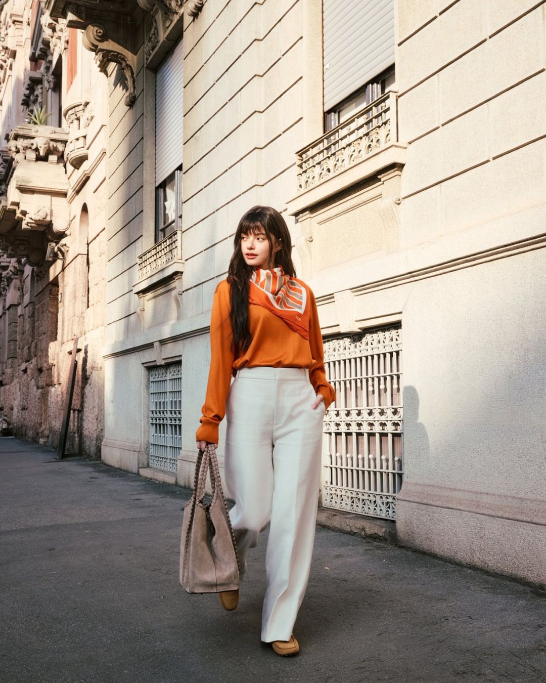 Cho tiết trời mùa xuân châu Âu vẫn còn se lạnh, Becky diện một set đồ ton-sur-ton với áo sơ mi dáng dài màu vàng mù tạt bên trong và áo khoác da lộn (suede jacket) màu nâu gạch bên ngoài. Bảng màu maillard ấm áp tôn lên làn da trắng của nữ diễn viên. Điểm nhấn tinh tế là chiếc khăn lụa thắt nhẹ, tạo nên sự cân bằng hoàn hảo giữa vẻ ngoài cá tính và nét nữ tính dịu dàng.