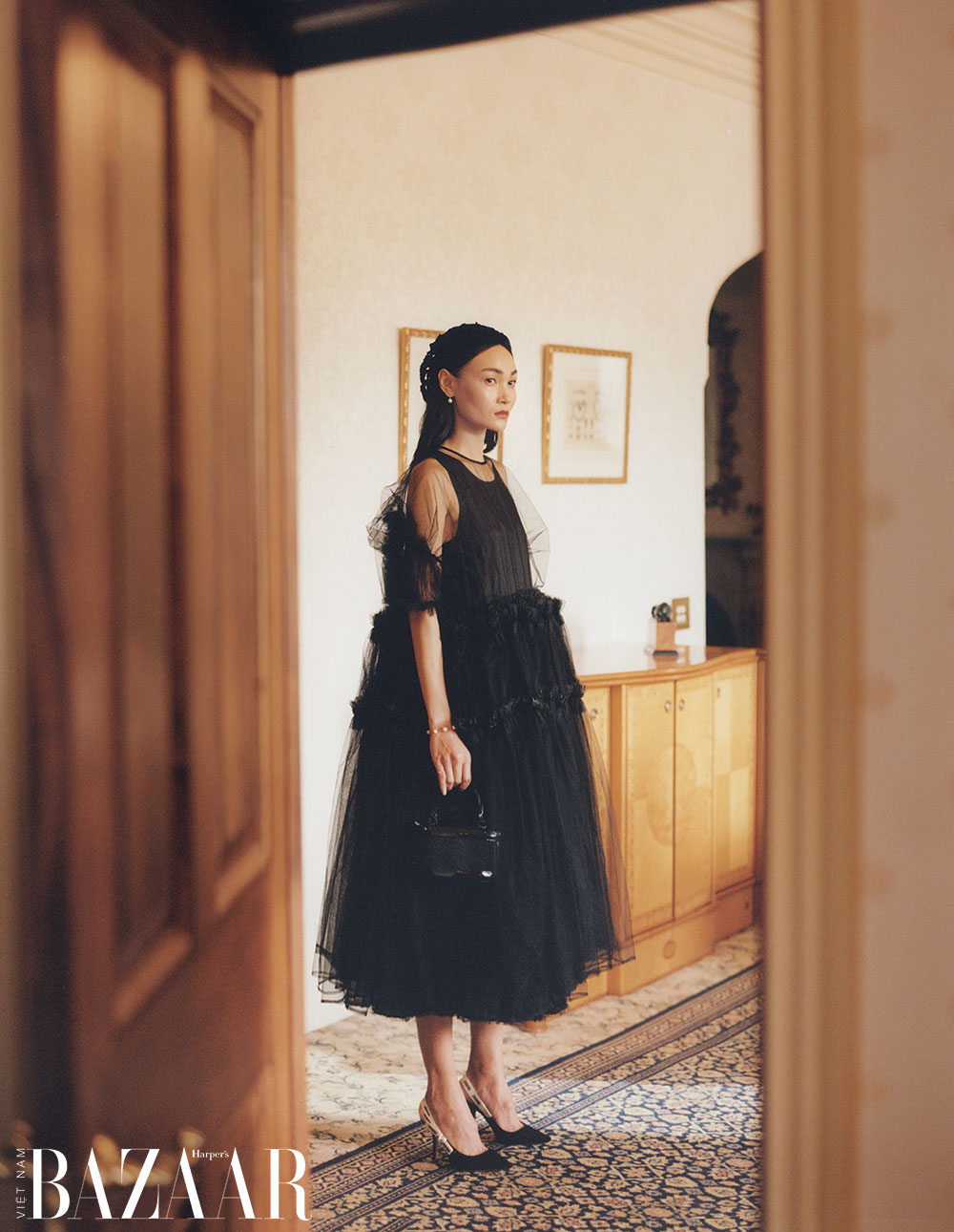Toàn bộ trang phục, Sleeping with Jacques. Túi xách, của stylist. Băng đô, Jennifer Behr. Bông tai và nhẫn, Sener Besim. Giày, Nelson Made