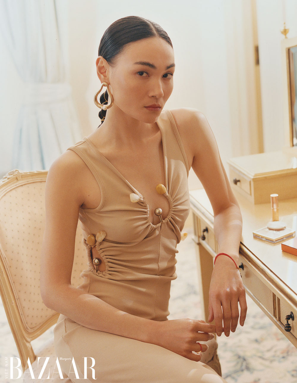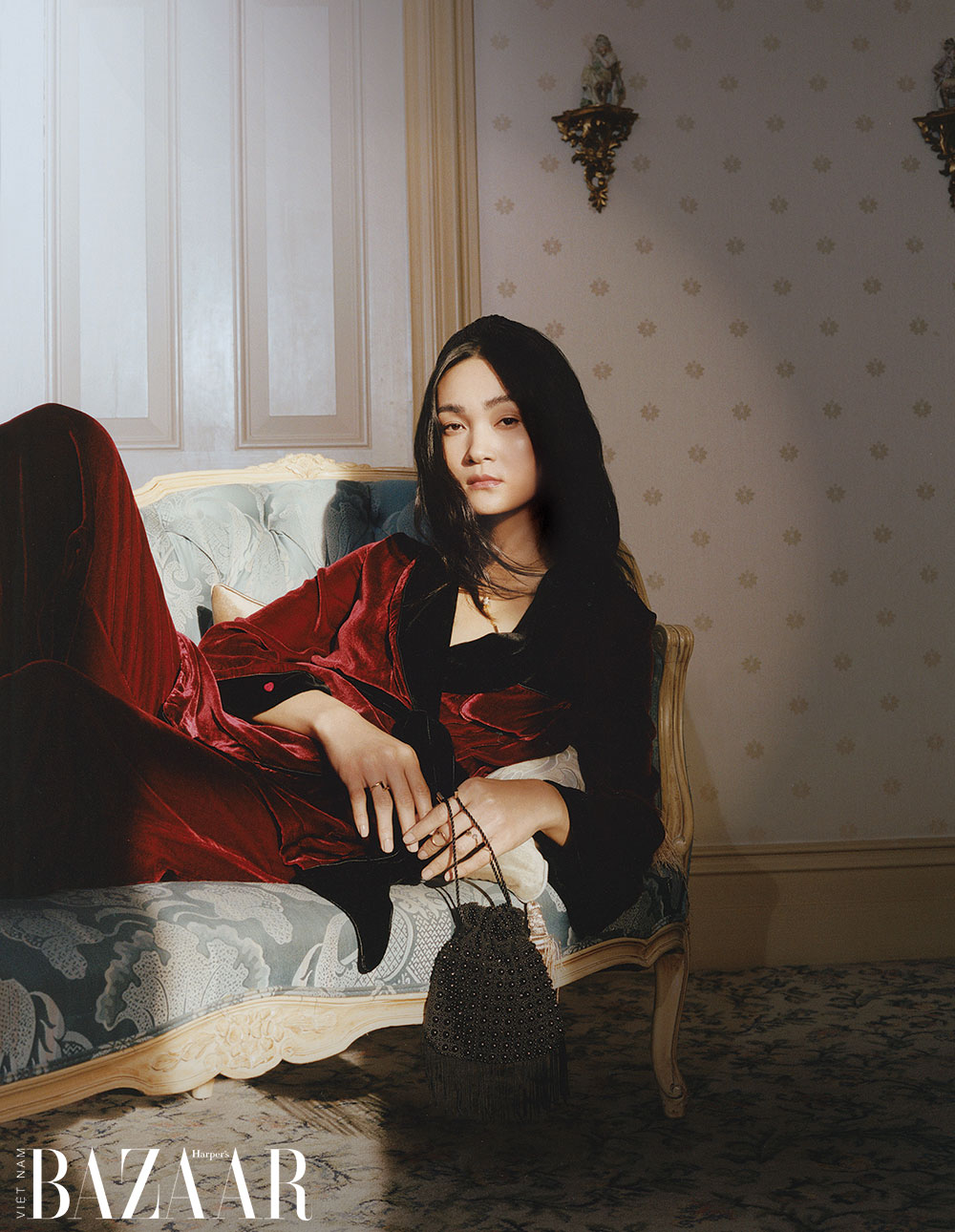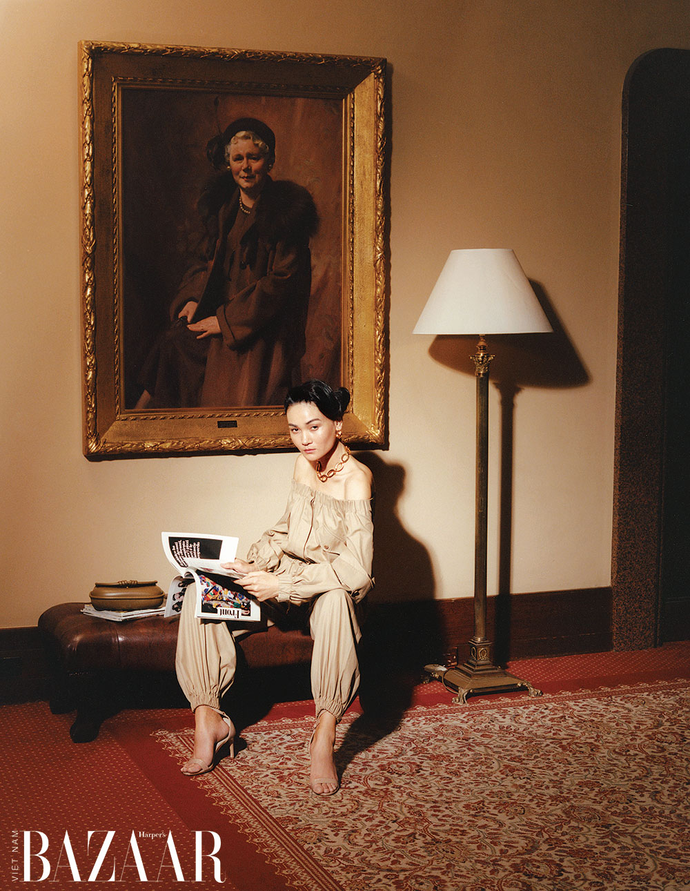 Toàn bộ trang phục, Common Hours. Thắt lưng (đeo ngang cổ), Common Hours. Bông tai; nhẫn, Sener Besim. Vòng tay, Adina’s Jewels. Giày, Jimmy Choo