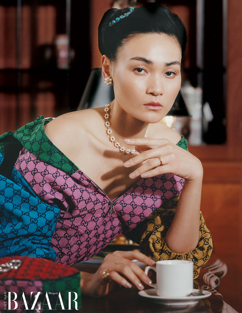 Toàn bộ trang phục, Gucci. Bông tai (cài trên tóc), Reliquia. Vòng cổ, Reliquia. Bông tai, Gucci. Túi xách, Gucci. Nhẫn, Sener Besim