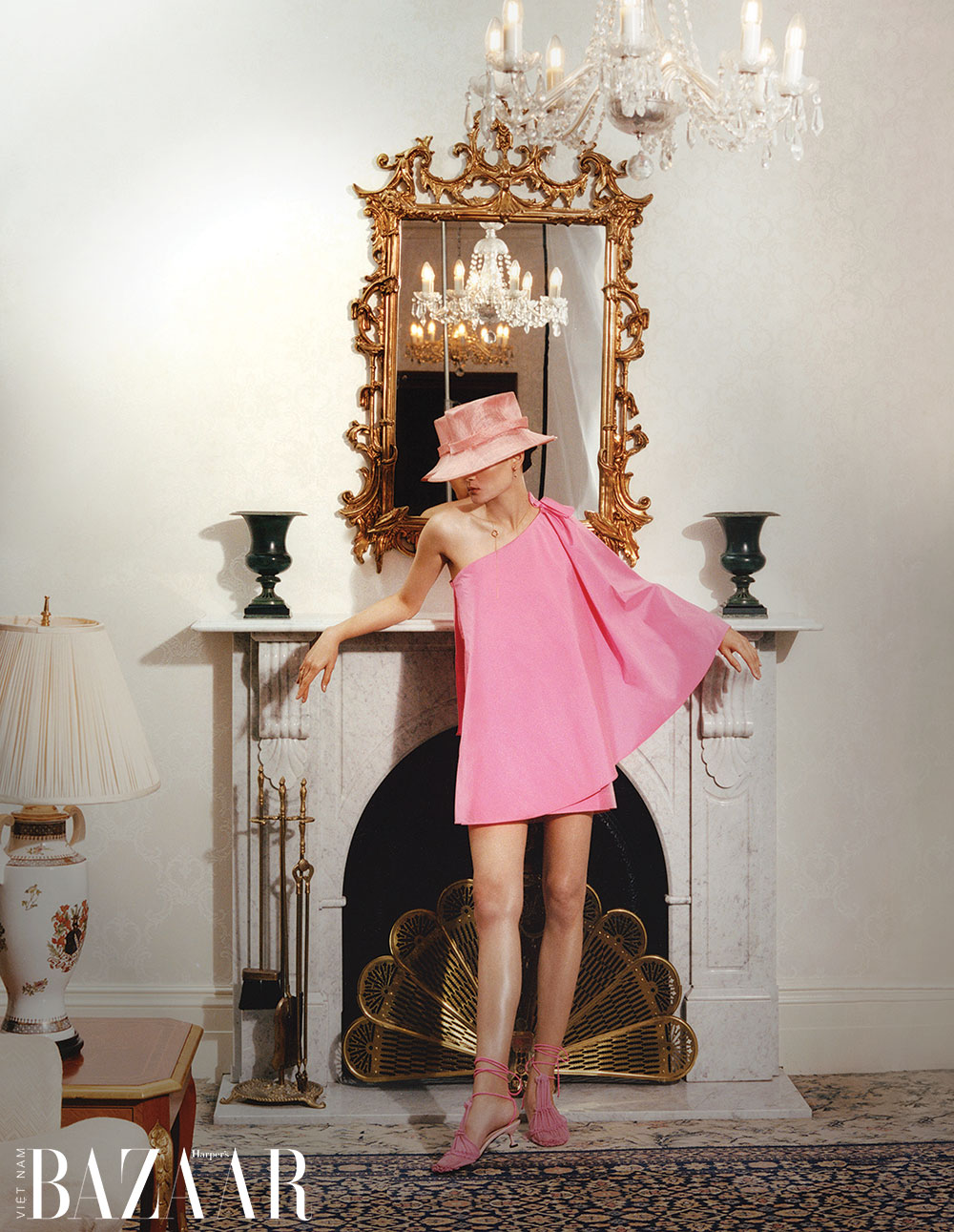 Đầm, Bernadette. Trang sức, Sener Besim. Nón, Stylist’s Archive. Giày, Katherine Nolan POA