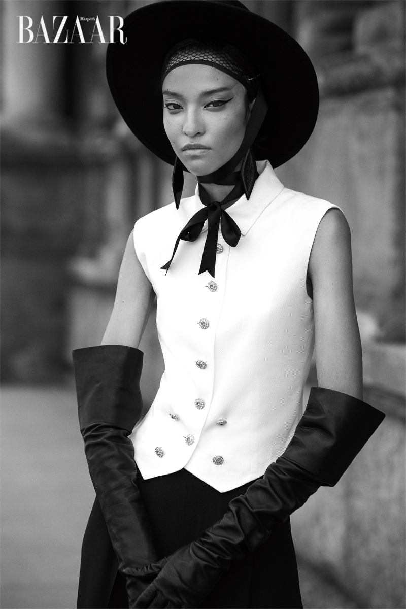 Áo sơ-mi không tay chi tiết nút bọc vải tweed Chanel, quần palazzo và bao tay da Max Mara; phụ kiện đội đầu Sharra Pagano, giày cao gót Max Mara, mũ rộng vành Pasquale Bonfilio
