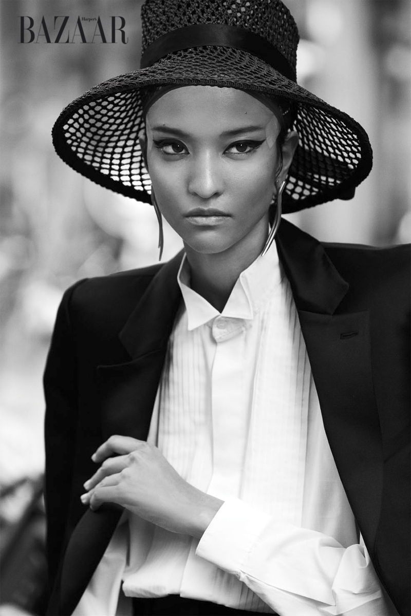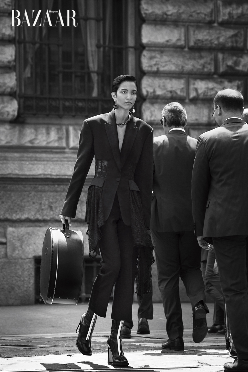 Áo khoác tuxedo có tay phối lông vũ Elie Saab, quần ống suông và giày cao gót Max Mara; khuyên tai và cài áo Gucci, mũ nồi Pasquale Bonfilio, túi saddle nắp gập Giorgio Armani