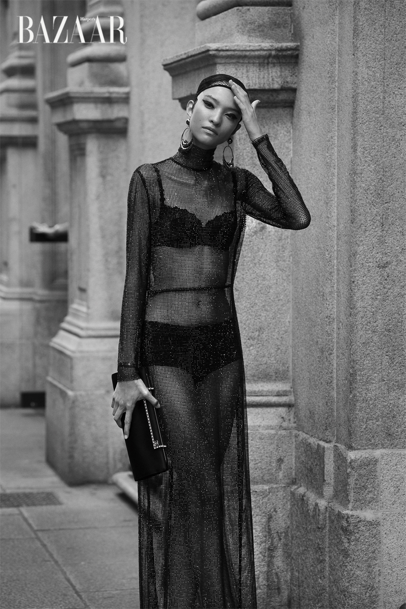 Set nội y La Perla, đầm dệt kim dài xuyên thấu Ermanno Servino, túi xách Chanel; khuyên tai Sharra Pagano, vòng tay Carbon Jewelry