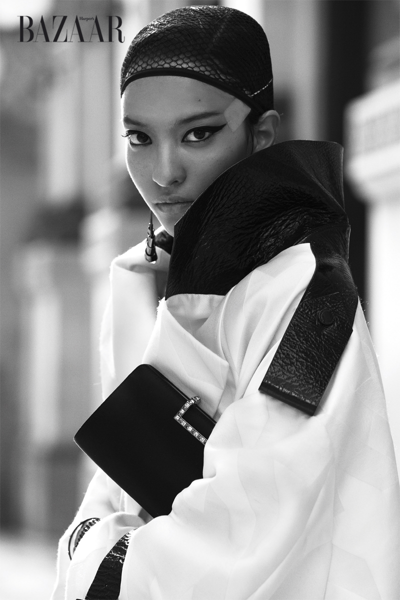 Áo tulle hở tay Salvatore Ferragamo, đầm mặc trong Loewe, quần Giorgio Armani, trang sức Sharra Pagano, phụ kiện nón, Pasquale Bonfilio