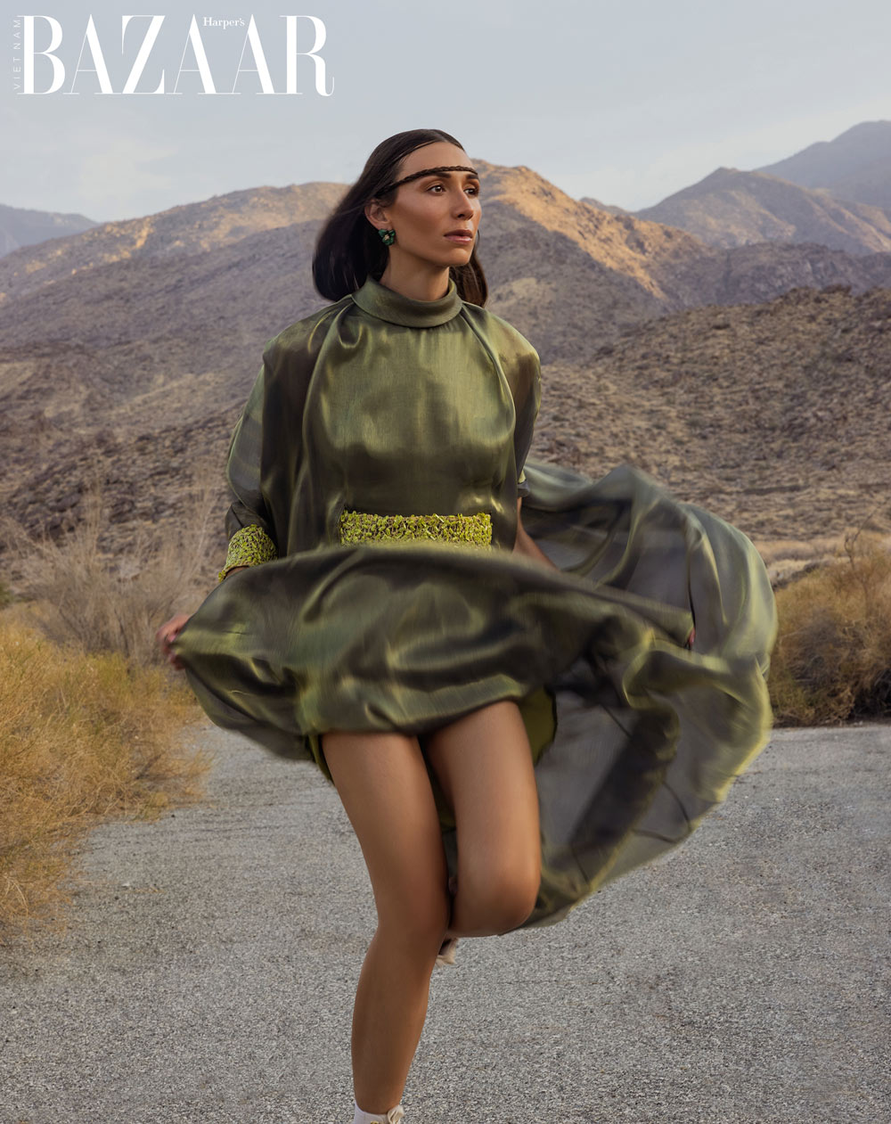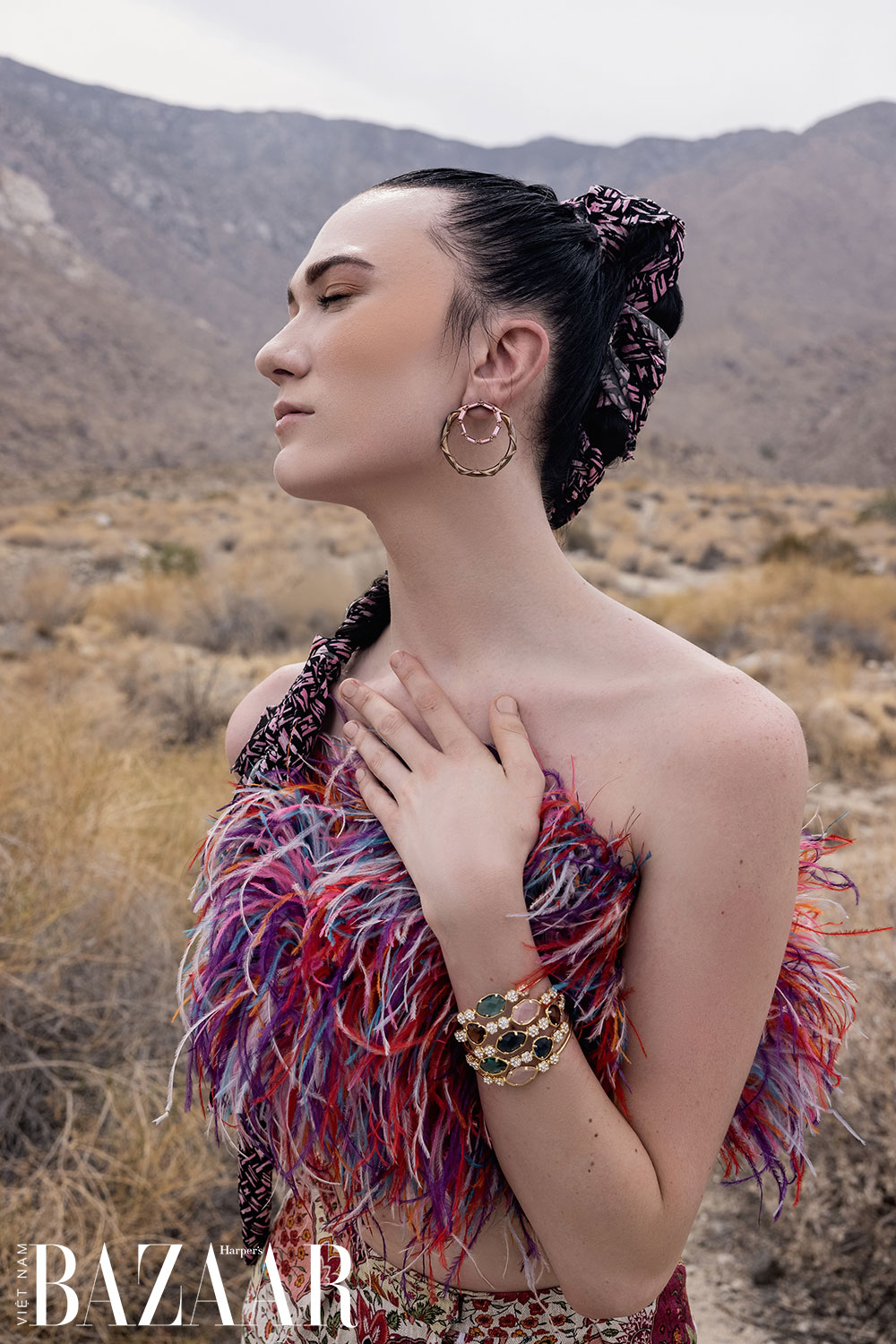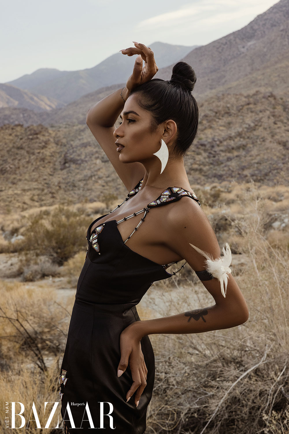 Bộ ảnh Whispers in the Desert: Lời thì thầm từ sa mạc. Đầm, Angel Brinks. Bông tai, Ethnic Ear Store. Vòng cổ, Patricio Parada. Phụ kiện tóc, SOS Showroom