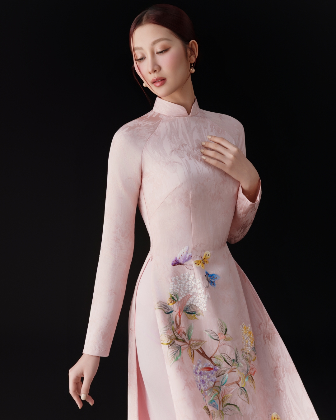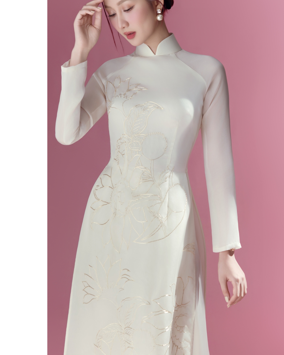 Từng đường kim, mũi chỉ truyền tải chính cảm xúc của nhà thiết kế muốn đặt để thông qua BST. Mỗi chi tiết nhỏ đều mang trong mình giá trị lao động, thời gian và tâm huyết. Chính sự tỉ mỉ ấy tạo nên chiều sâu cho từng thiết kế, giúp áo dài đẹp về cả hình thức lẫn giàu giá trị tinh thần.