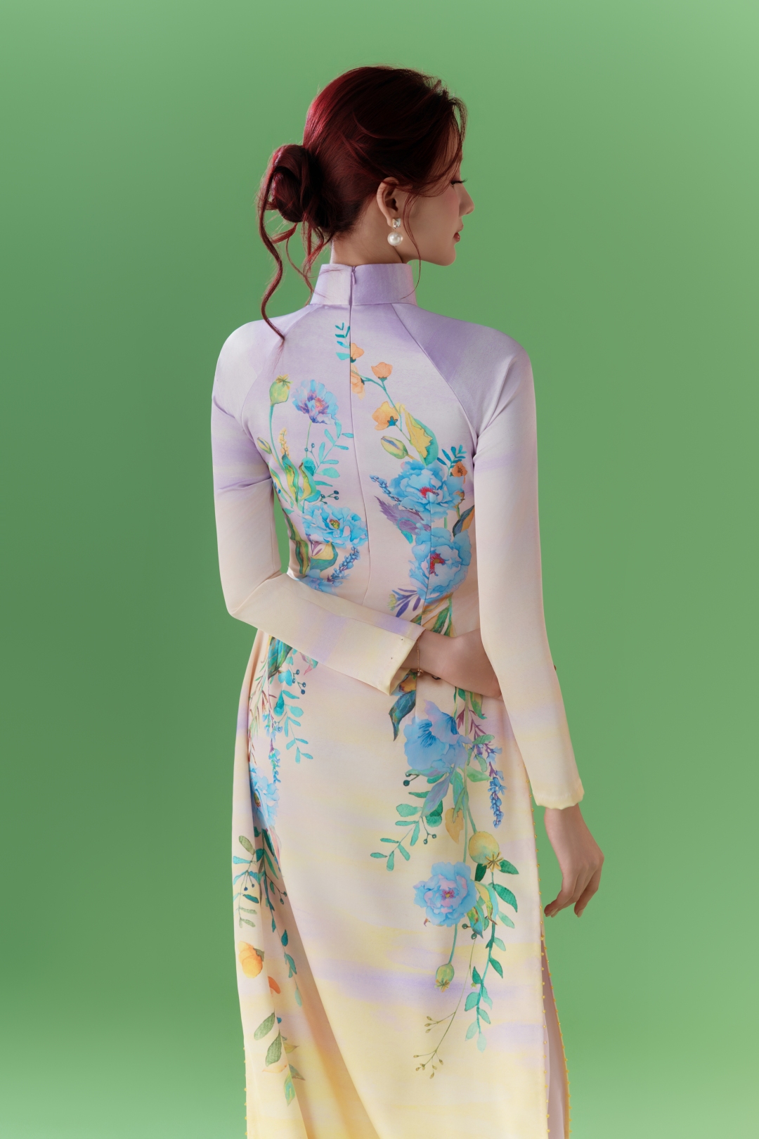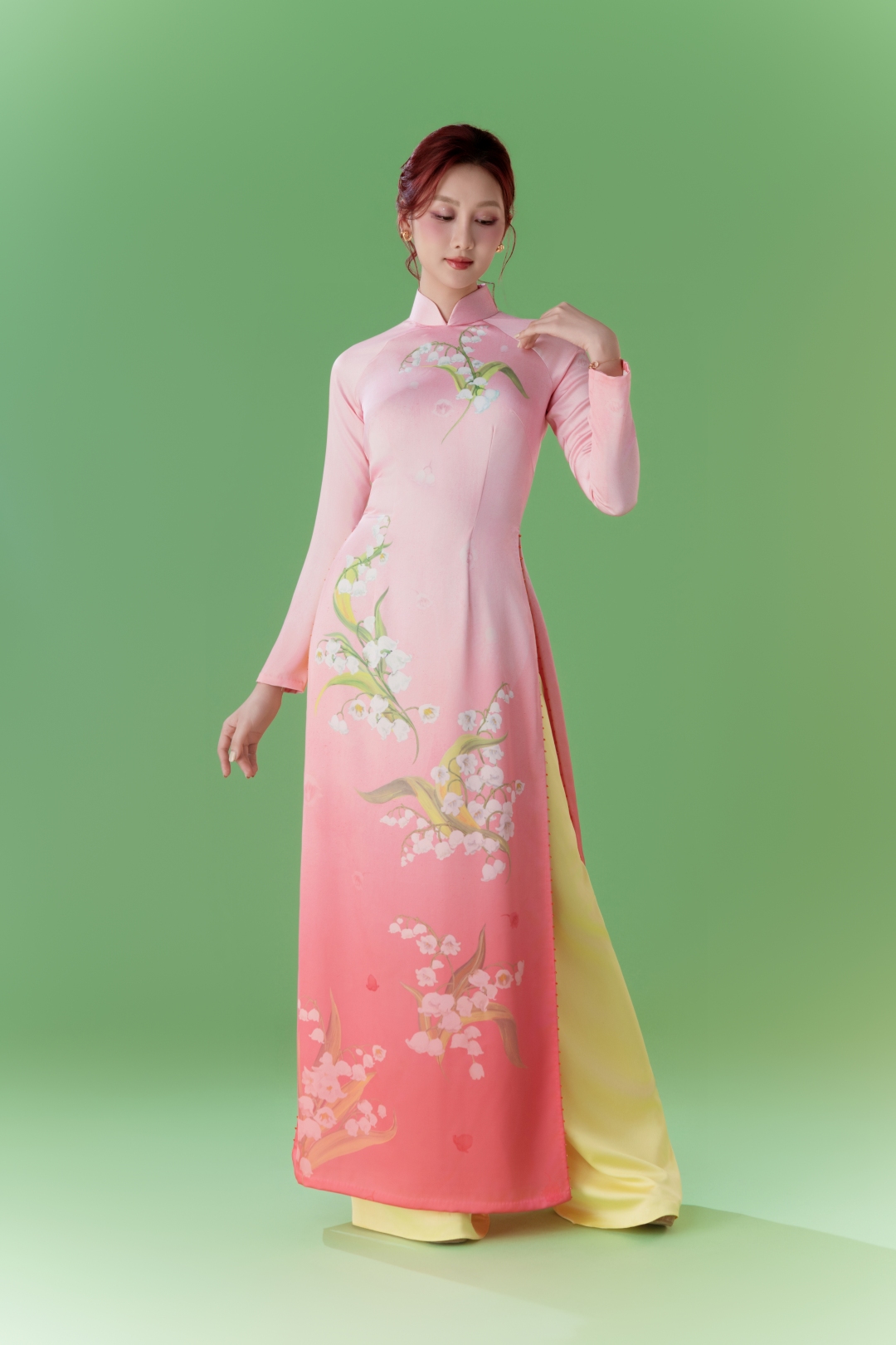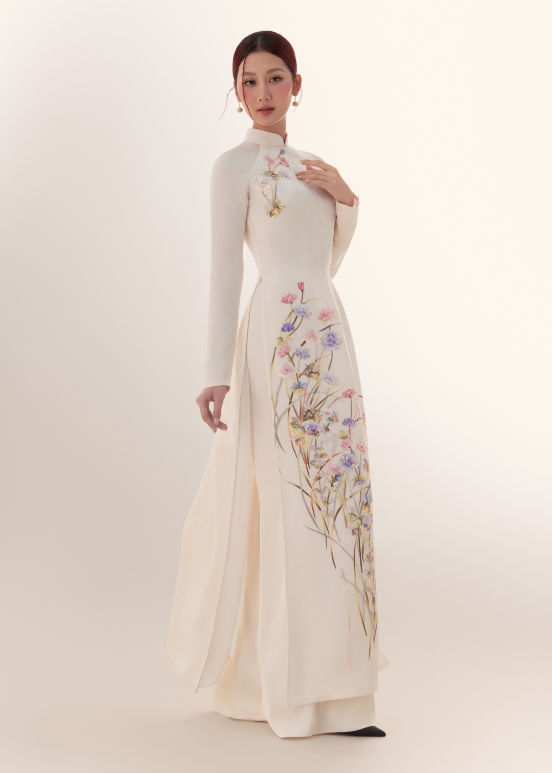 Trên nền lụa chuyển màu (ombre) cao cấp, các loài hoa được tái hiện bằng nét cọ mềm mại, giàu tính hội họa, tạo hiệu ứng thị giác như những bức tranh lụa sống động. Mỗi tà áo dài là một bức họa di động, ở đó thời trang giao thoa với mỹ thuật, kỹ thuật thủ công và tư duy thiết kế hiện đại đan cài trong một tổng thể hài hòa.