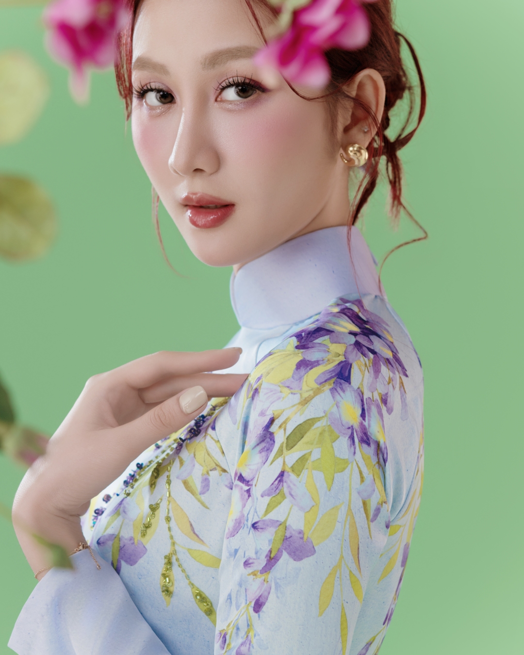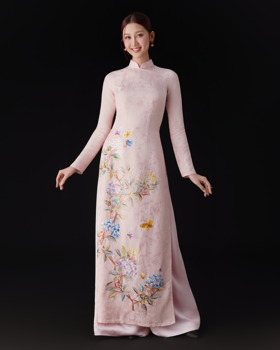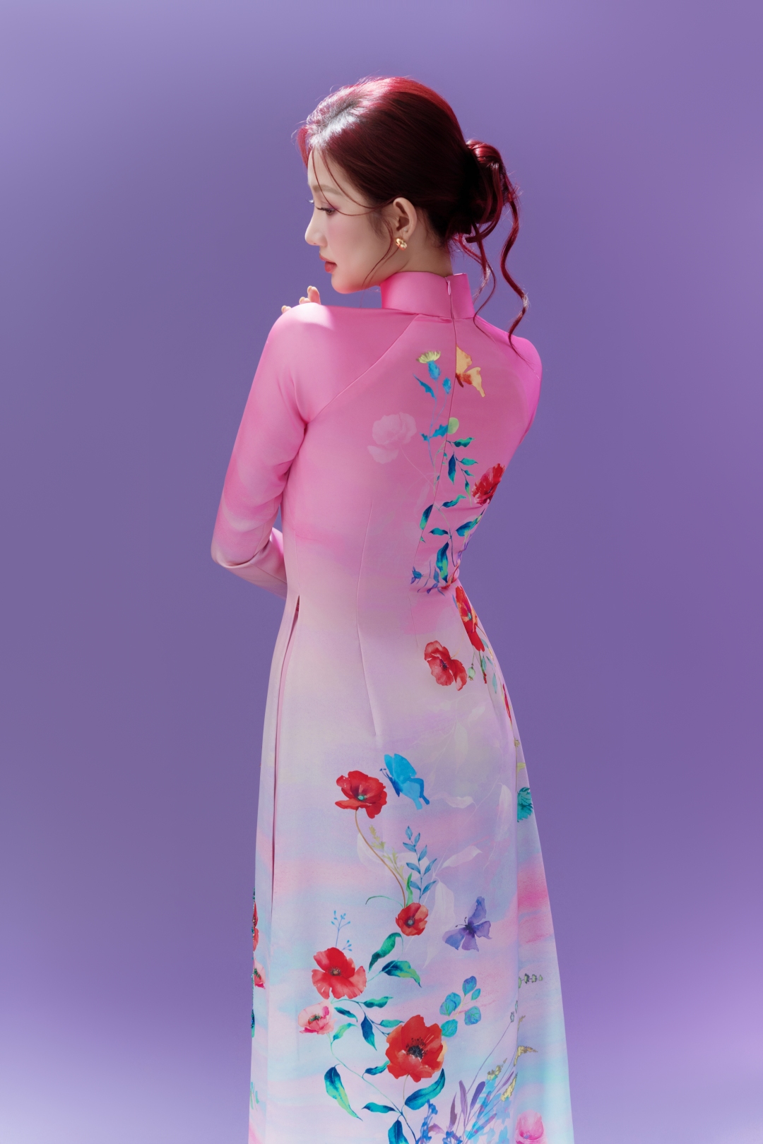Trên nền lụa chuyển màu (ombre) cao cấp, các loài hoa được tái hiện bằng nét cọ mềm mại, giàu tính hội họa, tạo hiệu ứng thị giác như những bức tranh lụa sống động. Mỗi tà áo dài là một bức họa di động, ở đó thời trang giao thoa với mỹ thuật, kỹ thuật thủ công và tư duy thiết kế hiện đại đan cài trong một tổng thể hài hòa.
