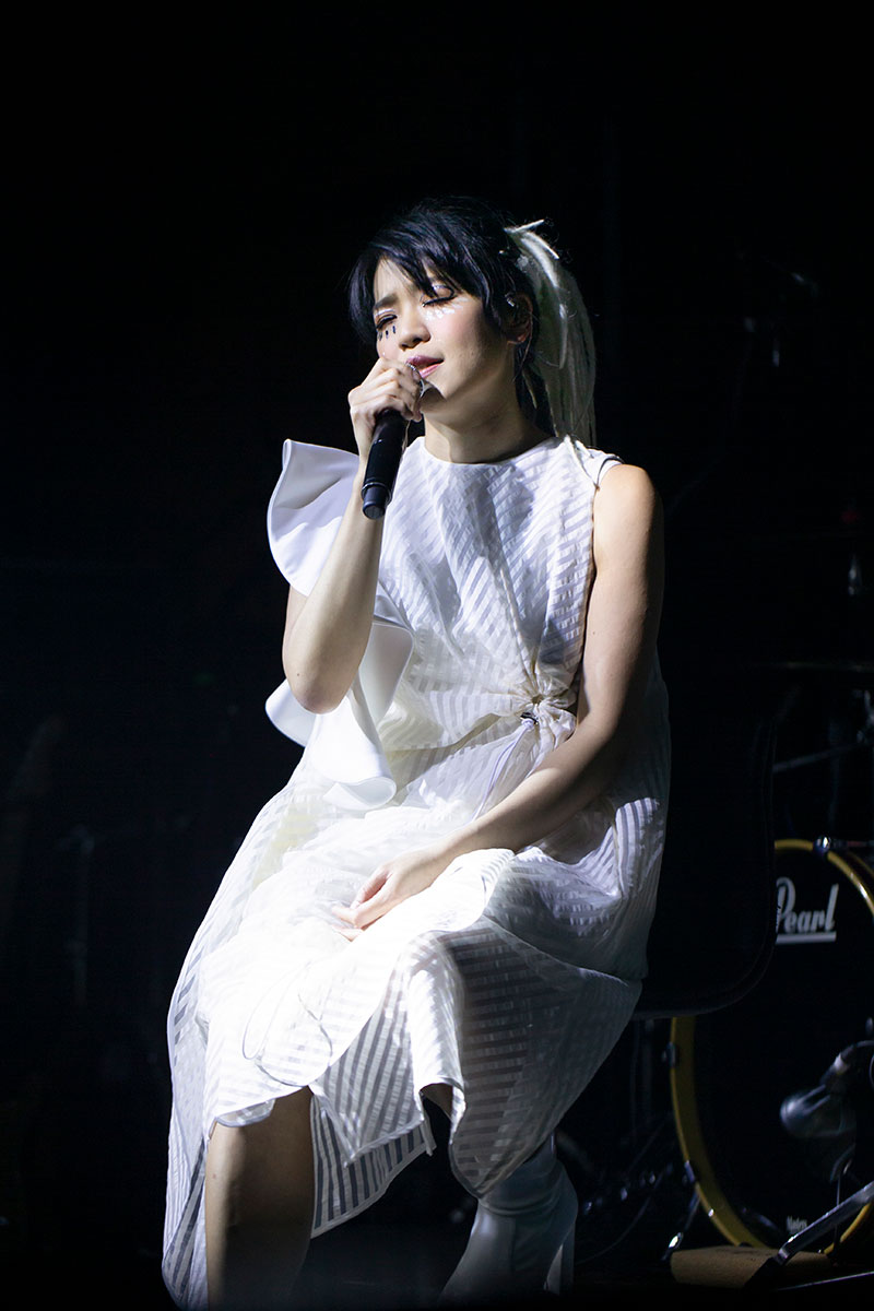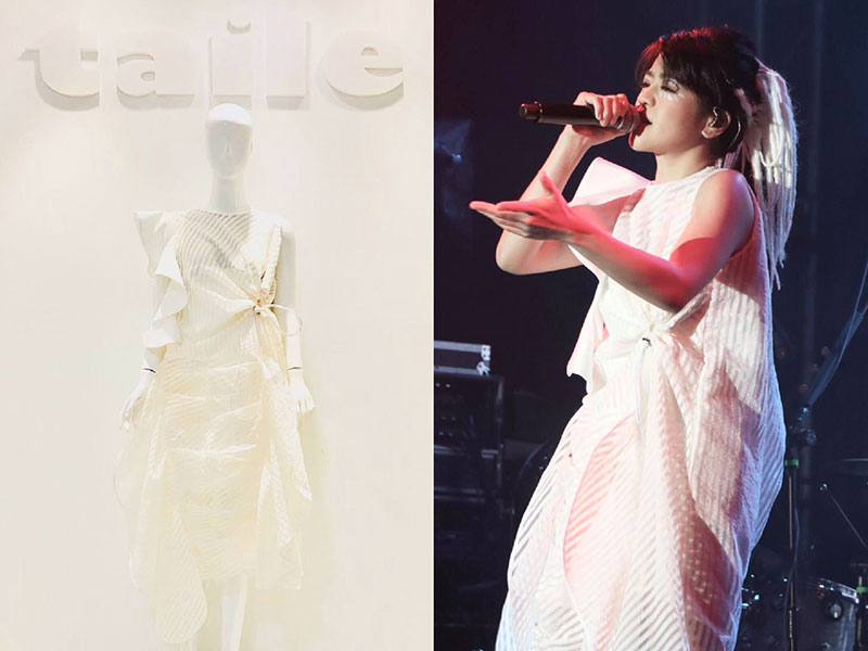 Chiếc đầm trắng cá tính của nhà thiết kế Việt Tai Le đã chinh phục nữ ca sỹ Lung Siu Kwan để xuất hiện tại concert của nhóm nhạc Carrier