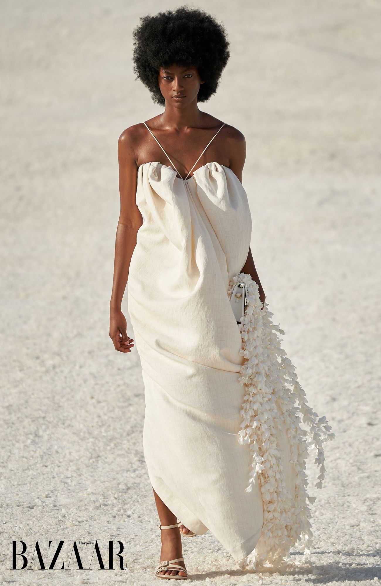 Nếu bạn thích phong cách Bohemian hay Cottagecore thì những bó hoa có độ dài, mềm rủ chính là lựa chọn cho bạn. Hãy nghĩ đến khoảnh khắc lãng mạn trong show Jacquemus Le Papier, khi người mẫu bước đi với túi xách có chùm hoa giấy thả dài.