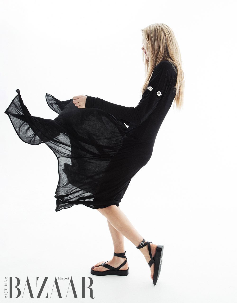 Còn trong trường hợp trang phục quá giản đơn, mà bạn bắt buộc phải chụp ảnh trong studio trên nền trắng thì sao? Hãy đề nghị người mẫu tạo dáng xuất thần. Những động tác tung váy, vung tay của người mẫu Daria Bezrukova tạo hình thù bắt mắt cho tấm ảnh. Bạn cũng có thể kết hợp một số phụ kiện trên nền background, ví dụ dải lụa phất lên, hay tấm voan giăng ngang. Chúng sẽ tăng sự thú vị cho tấm ảnh.