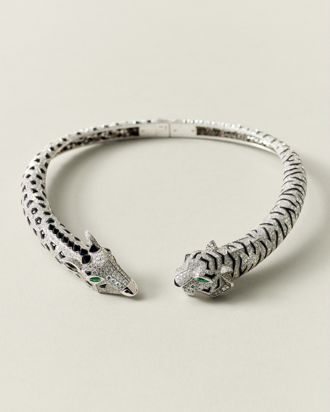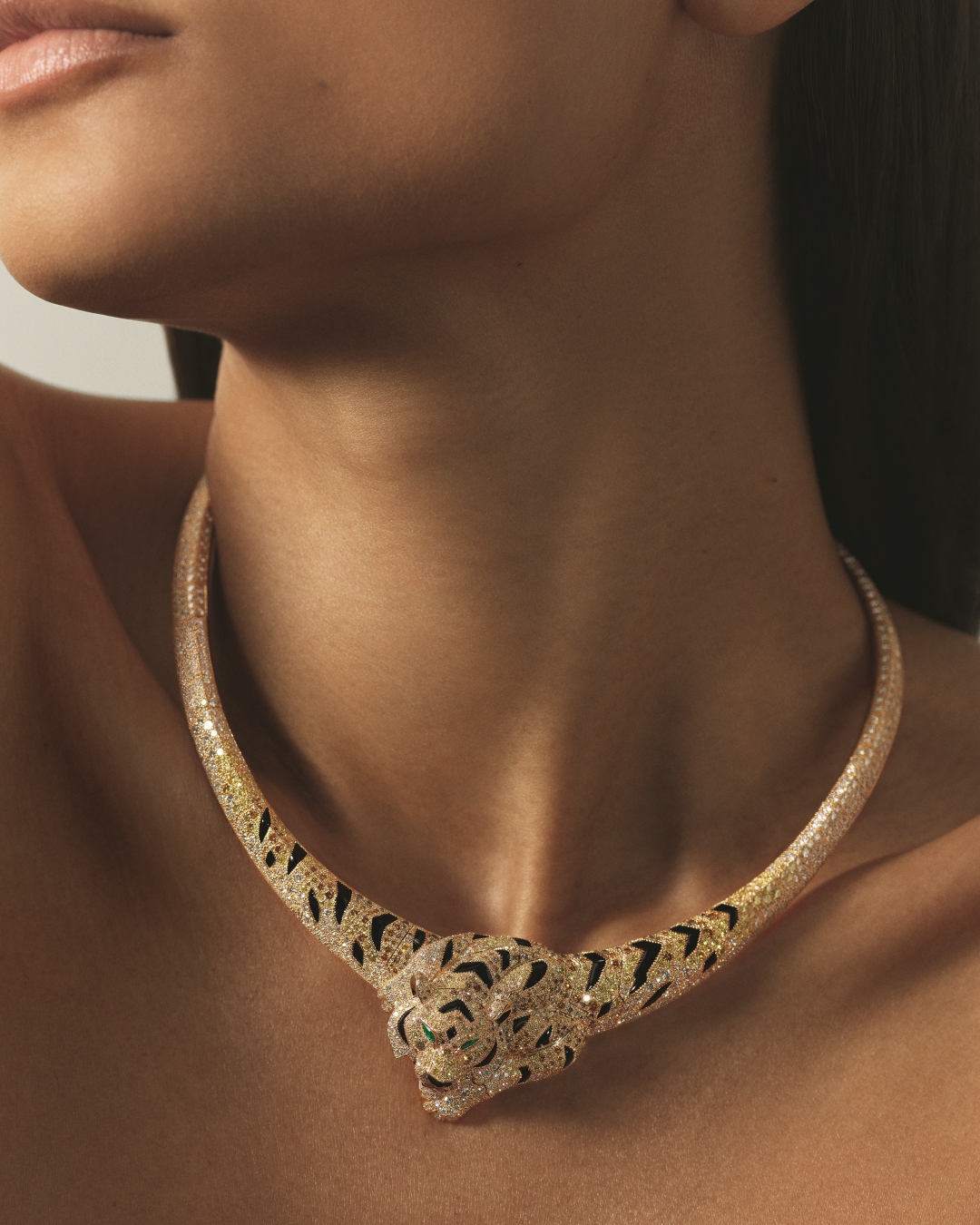 Hay con hổ vươn mình thành vòng cổ, với bộ lông kết từ kim cương vàng, cam, nâu và trắng, sọc onyx cắt riêng biệt, mắt emerald rực sáng và bàn chân khớp nối đặt tự tin trên làn da người đeo.