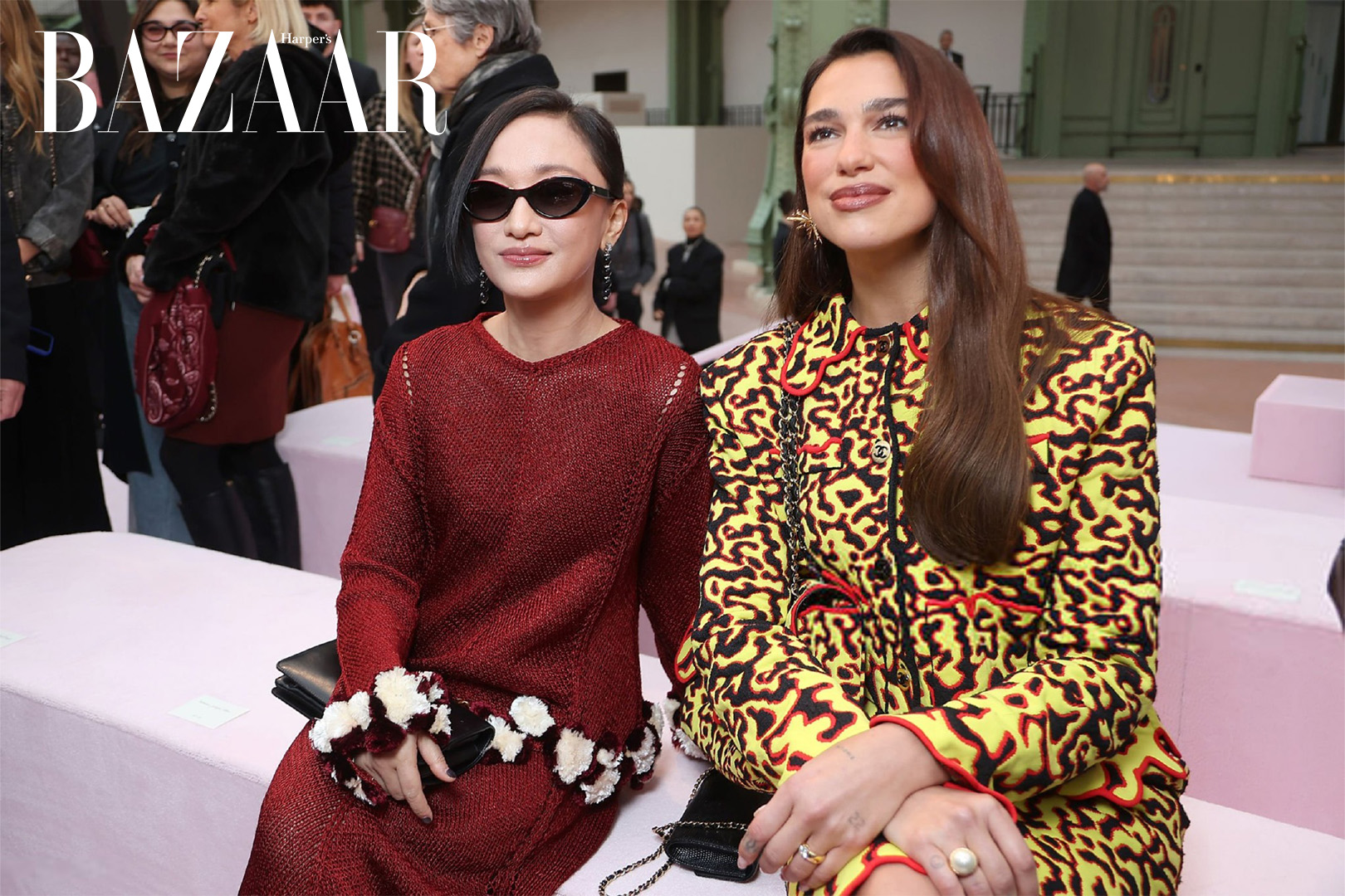 Châu Tấn chụp ảnh kỷ niệm cùng Dua Lipa trên hàng ghế đầu show Chanel Haute Couture Xuân Hè 2026. Ảnh: Weibo @BillboardBot