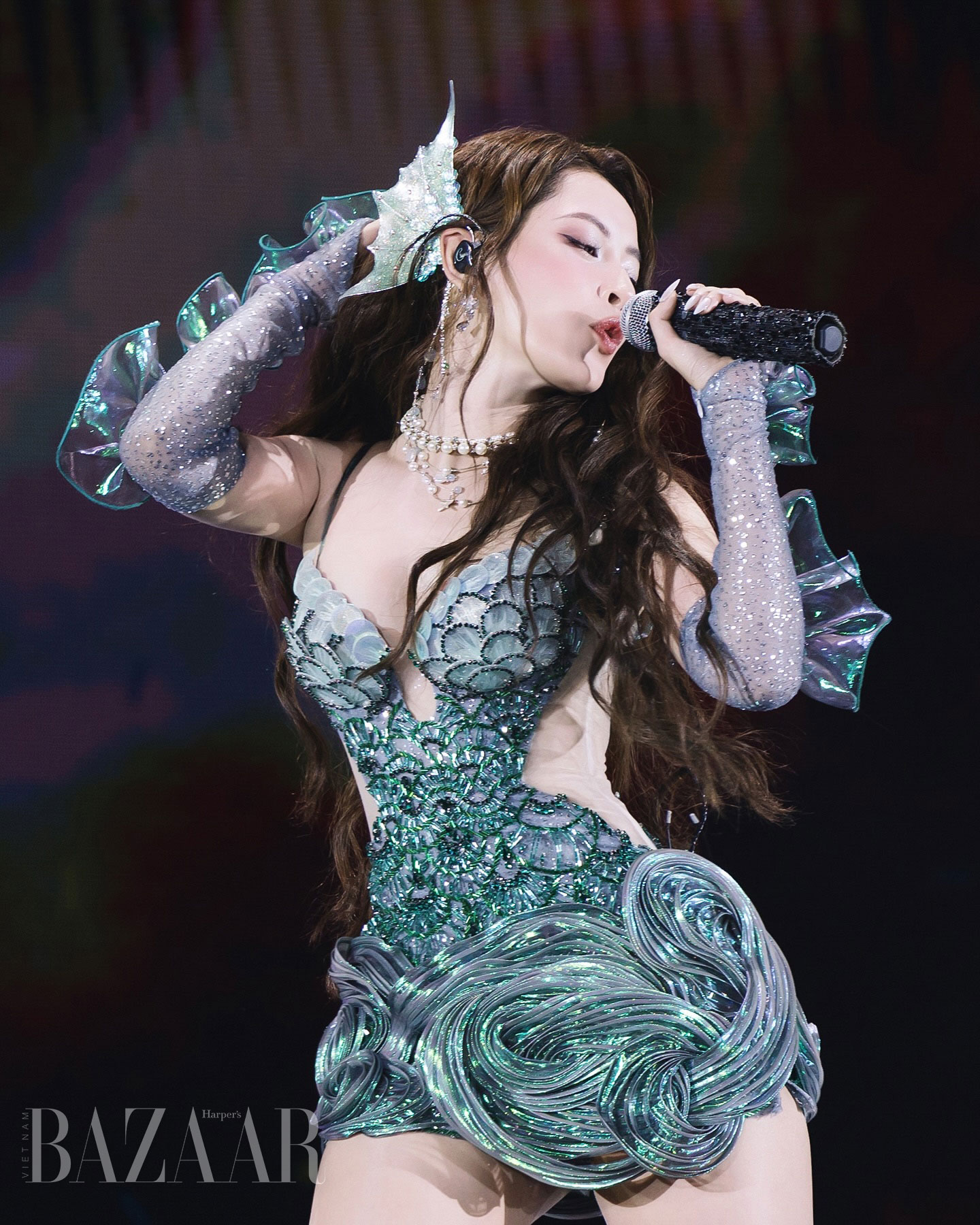 Trong khoảnh khắc buổi biểu diễn khai màn, không gian bỗng chốc chuyển hóa thành một giấc mộng nơi ánh sáng, âm nhạc và cảm xúc hòa quyện vào nhau. Trên nền sân khấu huyền ảo ấy, Chi Pu xuất hiện tựa nàng mỹ nhân ngư bước ra từ thần thoại trong thiết kế may đo riêng đến từ nhà mốt Hacchic Couture.