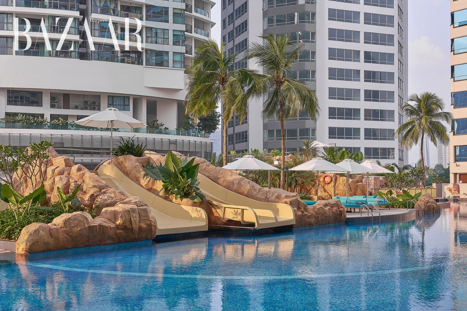 - Khu vực hồ bơi với cầu trượt riêng. Ảnh: Mariott