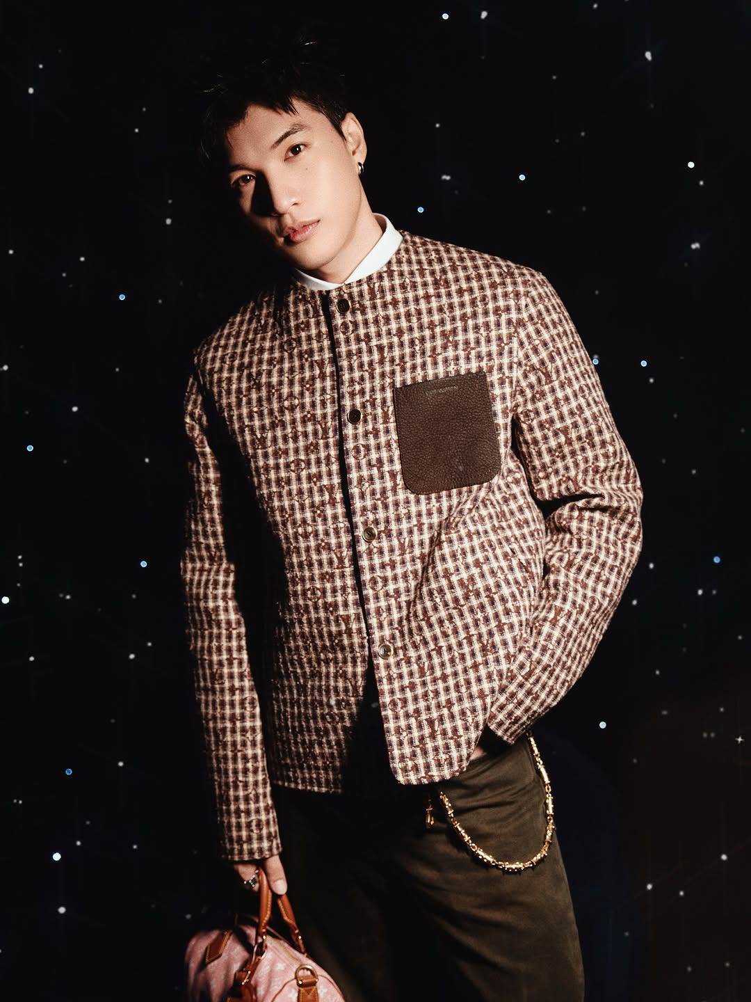Đi kèm với outfit, HIEUTHUHAI lựa chọn loạt phụ kiện cũng tới từ nhà mốt Pháp. Khuyên tai LV Spike dành riêng cho nam giới, thắt lưng Tubular Chain Belt ánh kim, vòng tay LV Wire, nhẫn LV Lozine và LV Damier, tất cả đều được xử lý trên nền bạc Sterling, giao thoa giữa di sản và tinh thần hiện đại.