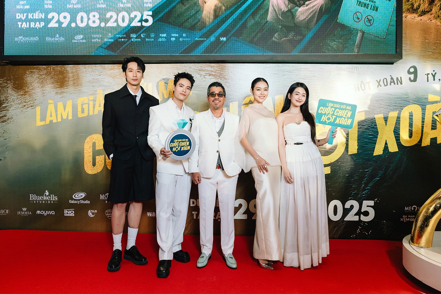 Tại lễ công bố dự án điện ảnh Làm Giàu Với Ma, dàn cast chính xuất hiện đầy rạng rỡ, thu hút mọi ánh nhìn trên thảm đỏ sự kiện. Võ Tấn Phát lịch lãm trong bộ suit trắng tinh khôi, mang theo phong thái vừa lãng tử vừa chững chạc. Bên cạnh anh, nam chính Tuấn Trần tạo dấu ấn cá tính với phong cách menswear phá cách áo khoác dài kết hợp cùng quần short.