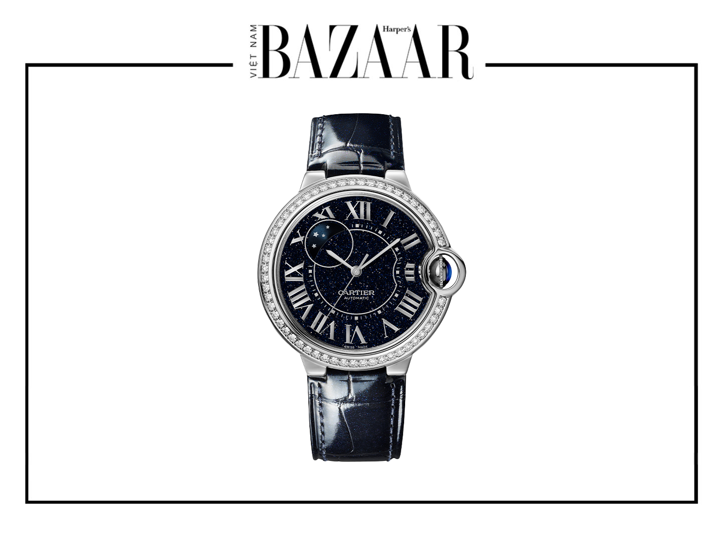 Đồng hồ Ballon Bleu de Cartier 36mm, bộ máy cơ lên dây tự động, biến thể Day/Night, vàng trắng, nạm kim cương, mặt số đá aventurine, đĩa hiển thị ngày – đêm, dây da.