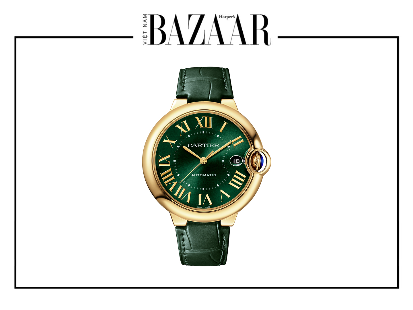 Đồng hồ Ballon Bleu de Cartier 40mm, bộ máy cơ lên dây tự động, vàng vàng, mặt số xanh lá hiệu ứng sunray, dây da có thể thay đổi.