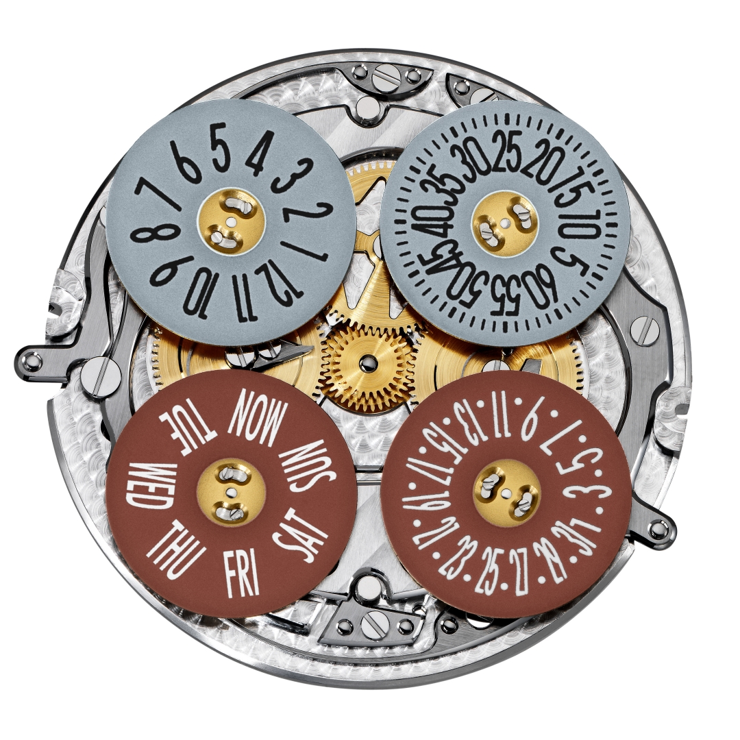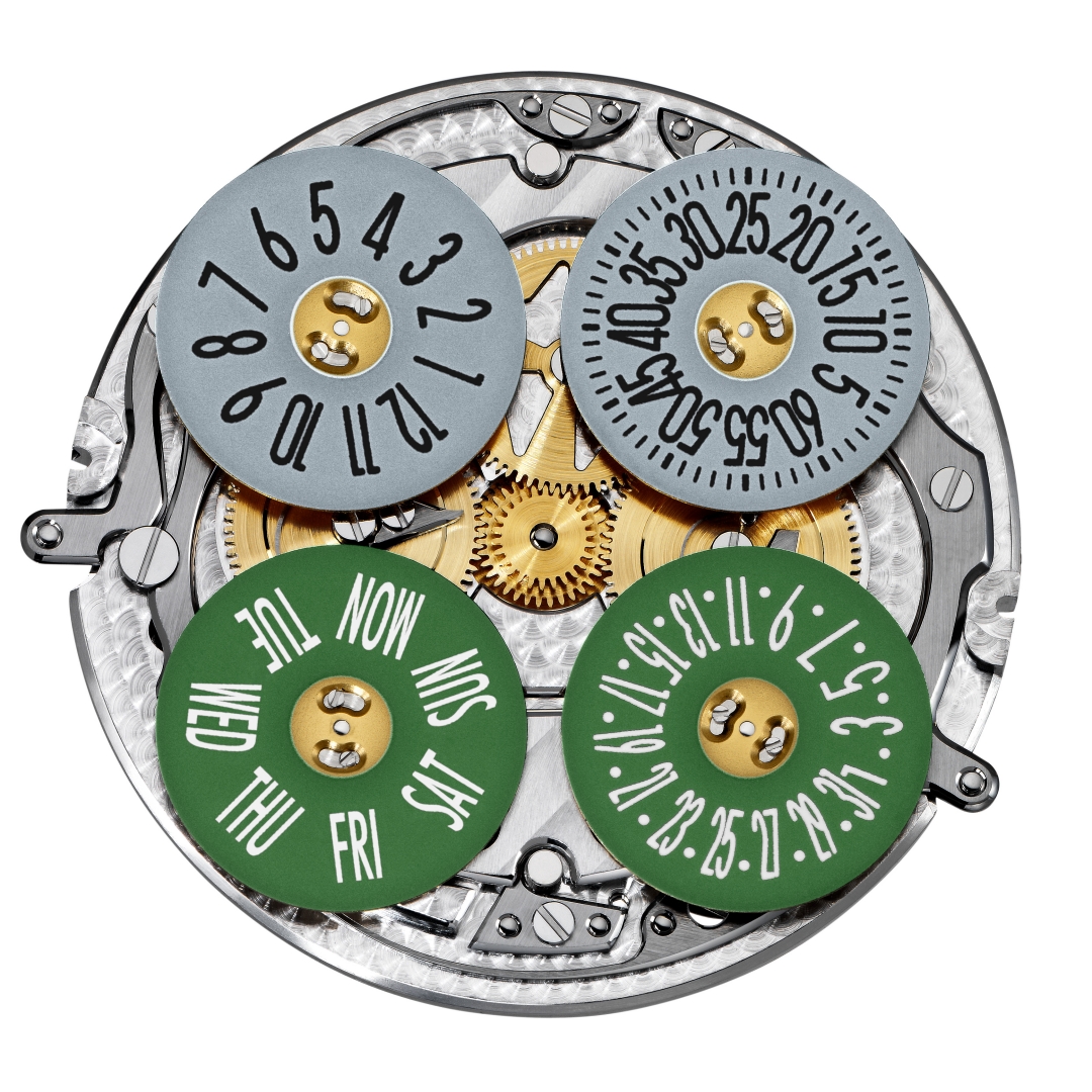 Thay vì kim giờ và phút, thời gian được hiển thị qua bốn ô cửa sổ đặt ở viền mặt số: giờ và phút ở phía trên, ngày và thứ ở phía dưới. Cơ cấu 237 chi tiết tinh xảo nằm gọn trong đường kính 31mm và độ dày chỉ 6,05mm, mang đến năng lượng dự trữ 40 giờ. Mặt sau bằng kính sapphire hé lộ con lắc dao động chế tác từ vàng 22K, khắc biểu tượng Maltese Cross.