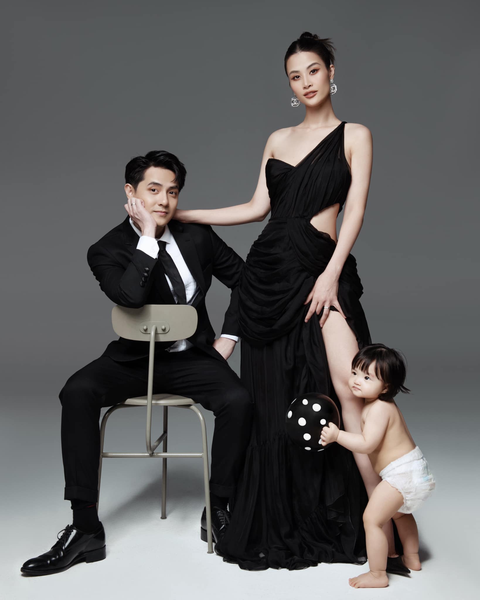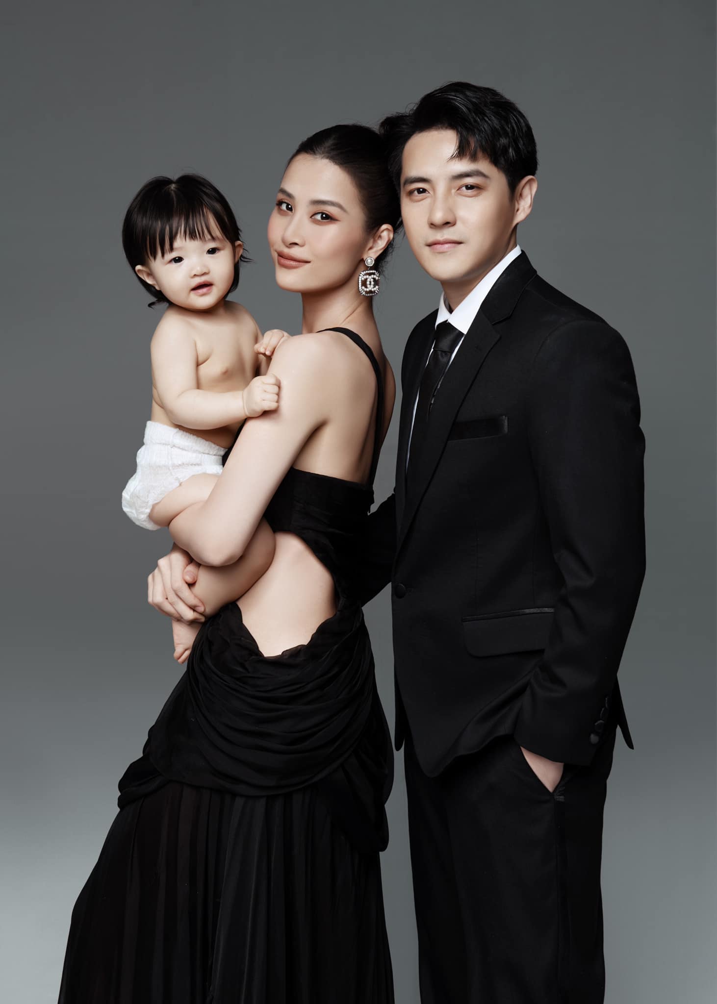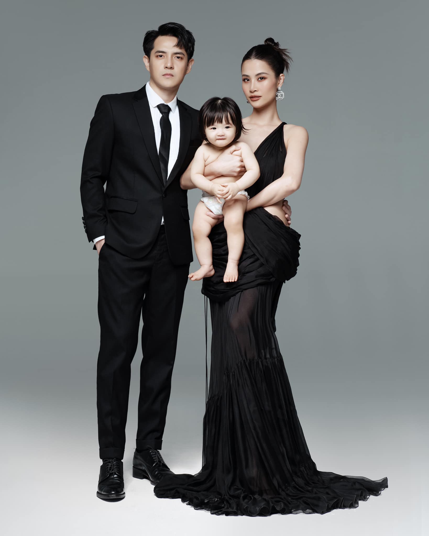 Chồng Ông Cao Thắng mặc bộ suit đen được may đo bảnh bao để ton-sur-ton với vợ. Còn bé Winnie thì chỉ mặc tã giấy.