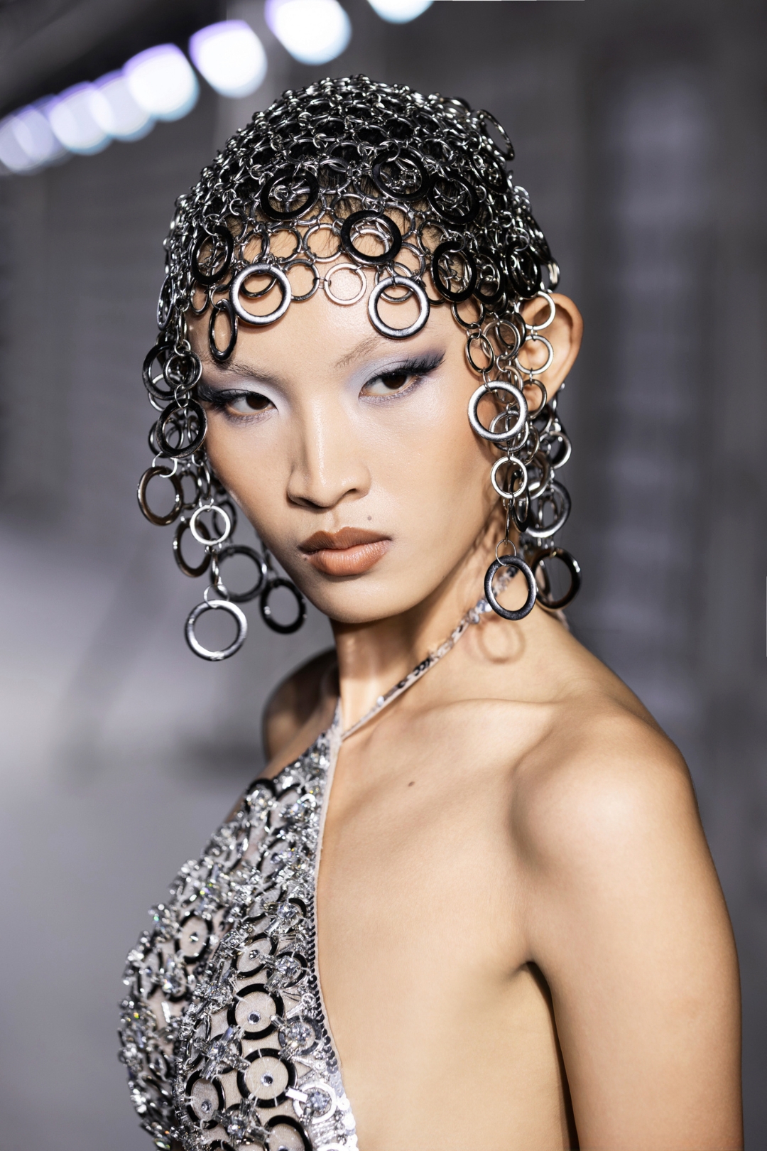 Khi âm nhạc chuyển sang tone dịu hơn, Minh Triệu xuất hiện khiến khán giả vỡ oà với style lả lơi cuốn hút. Từ đây, các thiết kế tiếp nối tinh thần “tái sinh” với tông màu rực rỡ, đa dạng từ đen, san hô đến vàng, đỏ. Ở đây, dễ nhận thấy sự tương phản giữa chất liệu và kỹ thuật xử lý từ bề mặt ánh kim đính kết tỉ mỉ đến những chất liệu thô mộc như da nâu, tua sợi hay vàng đồng. Kỹ thuật dựng phom 3D, cổ dựng cao, khoen kim loại và dáng đuôi cá ôm dáng cho thấy tư duy couture sắc nét.
