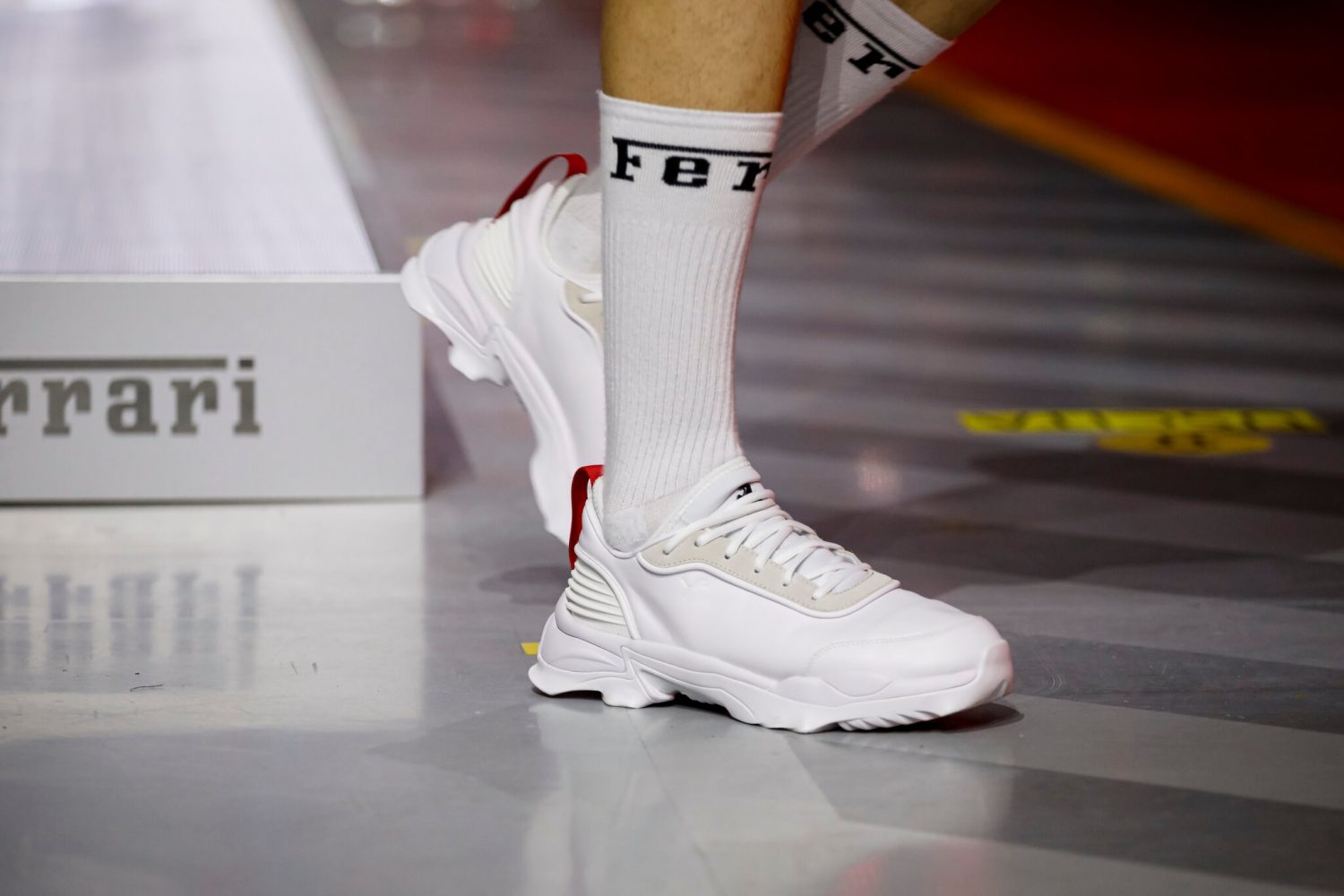 Giám đốc sáng tạo Iannone không quên đính kèm logo Ferrari vào các thiết kế. Chẳng hạn như trên vớ hay thắt lưng. Kiểu dáng gợi nhớ đến phong cách của nhà mốt Off-White.