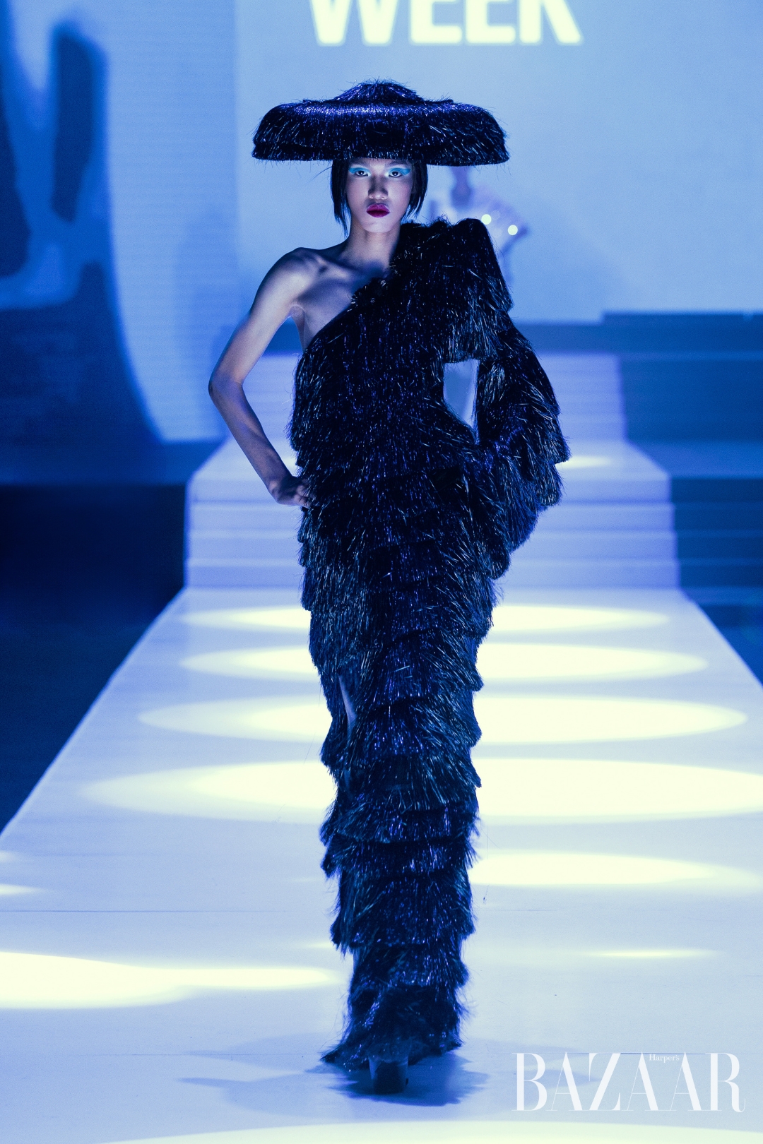 Mỗi thiết kế trong Nocturne Éternelle là một tuyệt tác táo bạo, nơi hình khối, màu sắc và chất liệu hòa quyện tạo nên bản giao hưởng của bóng tối và ánh sáng. Từ sắc đen huyền bí trên nền sheer mesh cao cấp, đến kỹ thuật đính kết thủ công tinh xảo phối cùng những gam xanh cobalt sâu thẳm như đại dương, tất cả cùng tỏa sáng trong một màn trình diễn mang đậm dấu ấn cá nhân của Frederick Lee.