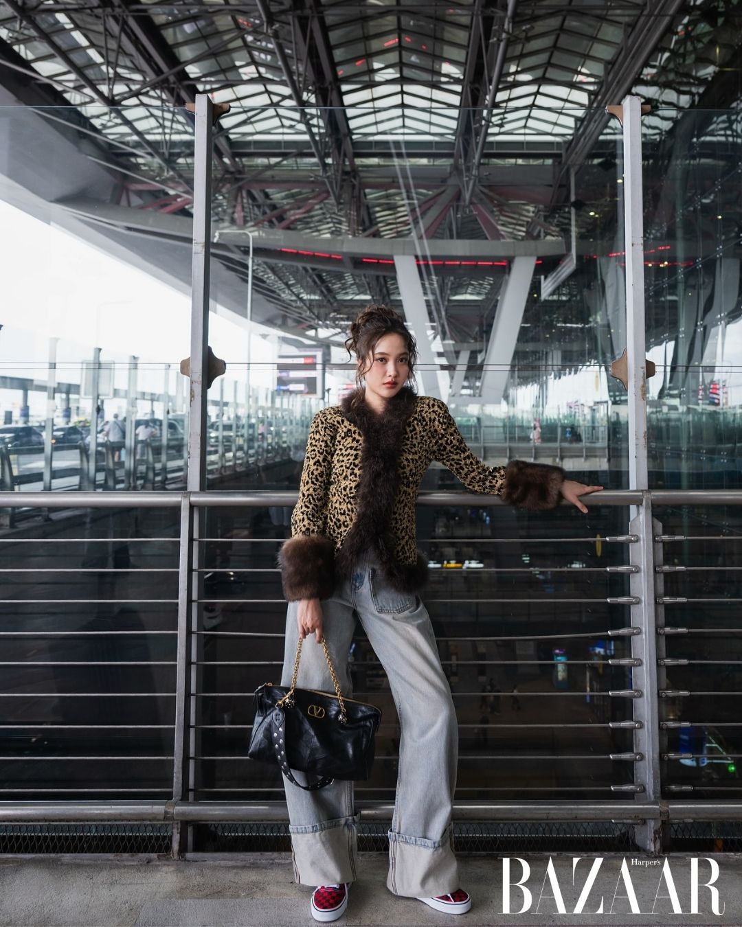 Trước đó, Freen xuất hiện tại sân bay Charles de Gaulle (Paris) trong bộ trang phục streetwear phá cách. Cô khoác ngoài chiếc áo da họa tiết da báo phối cùng quần jeans xanh nhạt, điểm xuyết bởi đôi sneaker caro thuộc dòng Valentino Thu Đông 2025, mang lại vẻ năng động, hiện đại.