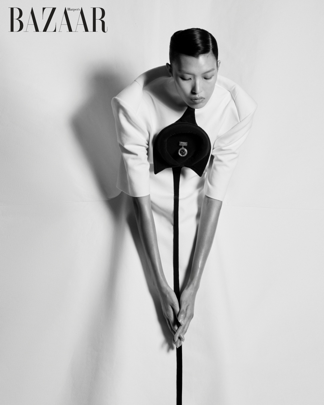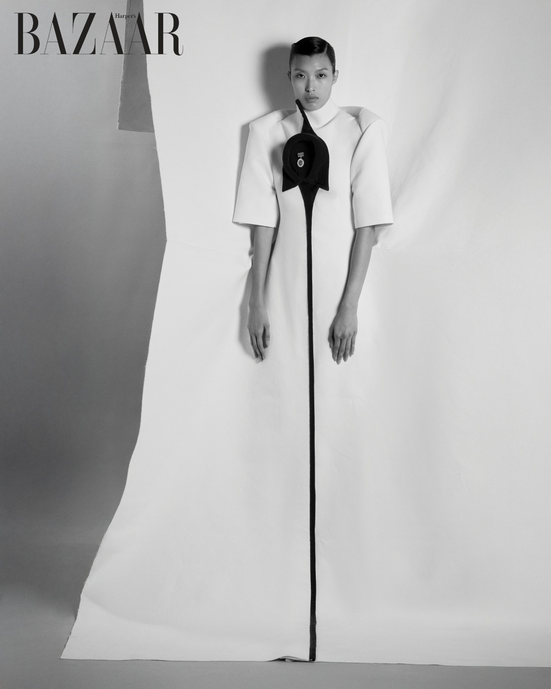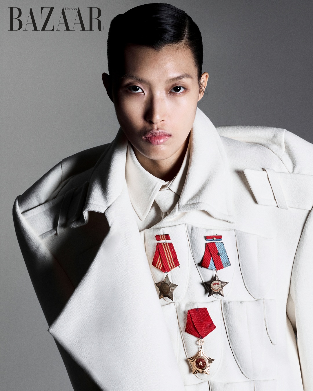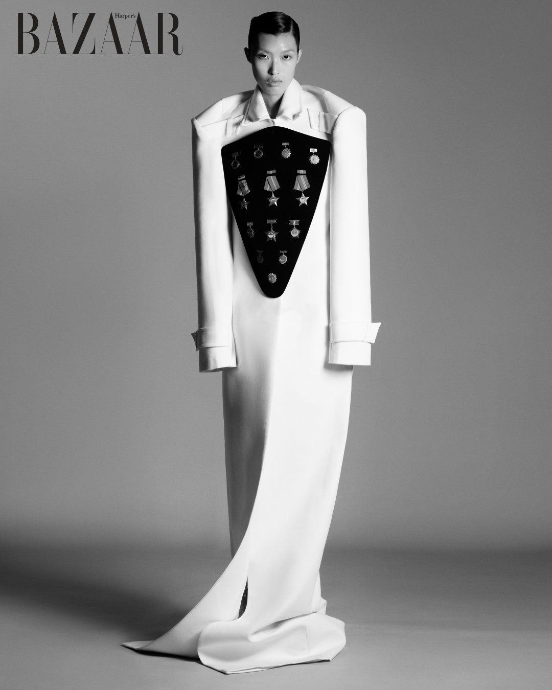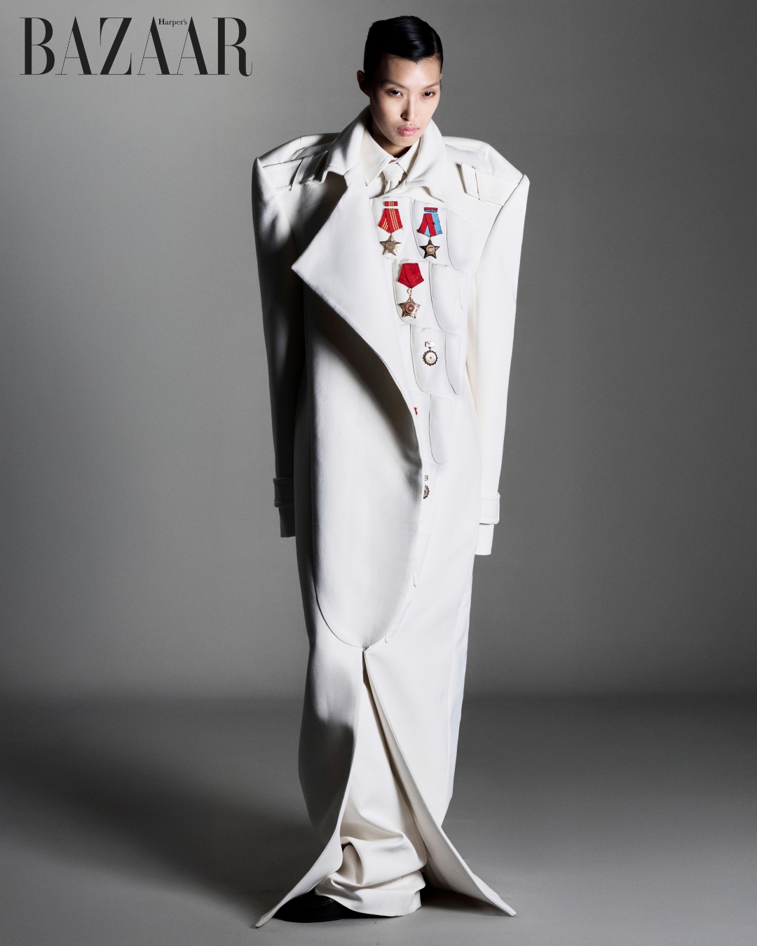 Áo khoác dài dựng cầu vai gợi nhớ hình ảnh quân phục. Tấm huân chương đỏ trước ngực tượng trưng cho dòng máu đã cứu chữa những người lính đã quần tụ thành chứng tích lịch sử.