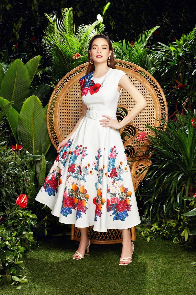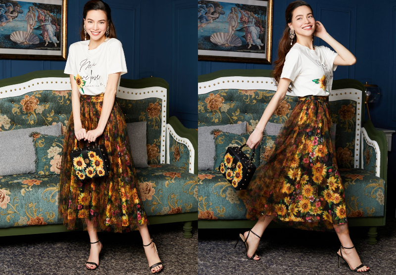Hồ Ngọc Hà trẻ trung với chân váy hoa phối cùng áo thun. Đây là set đồ nằm trong dòng sản phẩm ready to wear của NEVA Fashion.
