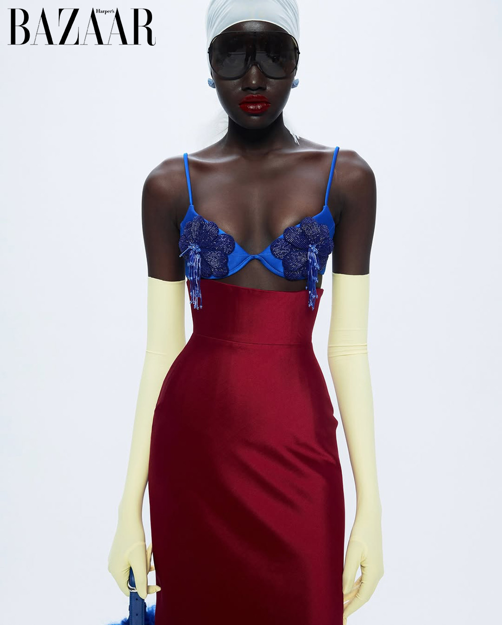 Thiết kế mà Hoa hậu Kỳ Duyên lựa chọn mang dấu ấn color block đặc trưng, với sự đối lập mạnh mẽ giữa hai gam màu đỏ và xanh cobalt. Để tạo sự hài hòa cho tổng thể đồng thời không phá vỡ nguyên tắc phối màu của trang phục, nàng hậu đã chọn chiếc áo corset bên trong mang sắc xanh dương, phối cùng corset xanh cobalt bên ngoài. Đây là hai tông màu liền kề trên bánh xe màu sắc, tạo nên hiệu ứng chuyển sắc hài hòa. Hoàn thiện diện mạo, Kỳ Duyên tiếp tục chọn túi xách và giày ton-sur-tone, khiến outfit trở thành một tổng thể cân bằng, thời thượng và tinh tế.