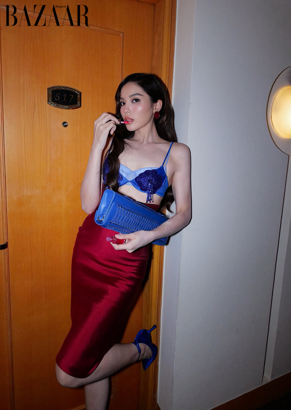 Trong những hình ảnh vừa đăng tải trên trang cá nhân, Hoa hậu Kỳ Duyên gây chú ý khi diện outfit gồm chân váy satin đỏ bó eo phối cùng áo bra top màu cobalt. Đây là một trong những look thuộc bộ sưu tập FANCì Club Xuân Hè 2026 vừa ra mắt vào tháng Sáu vừa qua. Tuy nhiên nàng hậu 9X khéo léo làm mới thiết kế với cách phối đầy táo bạo.