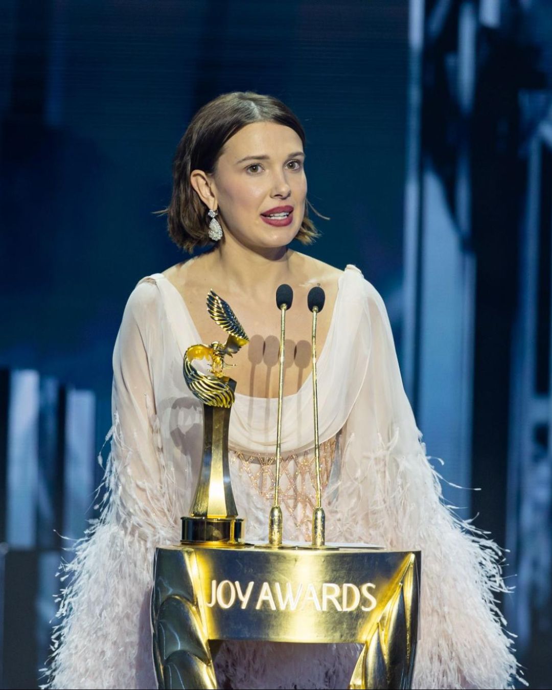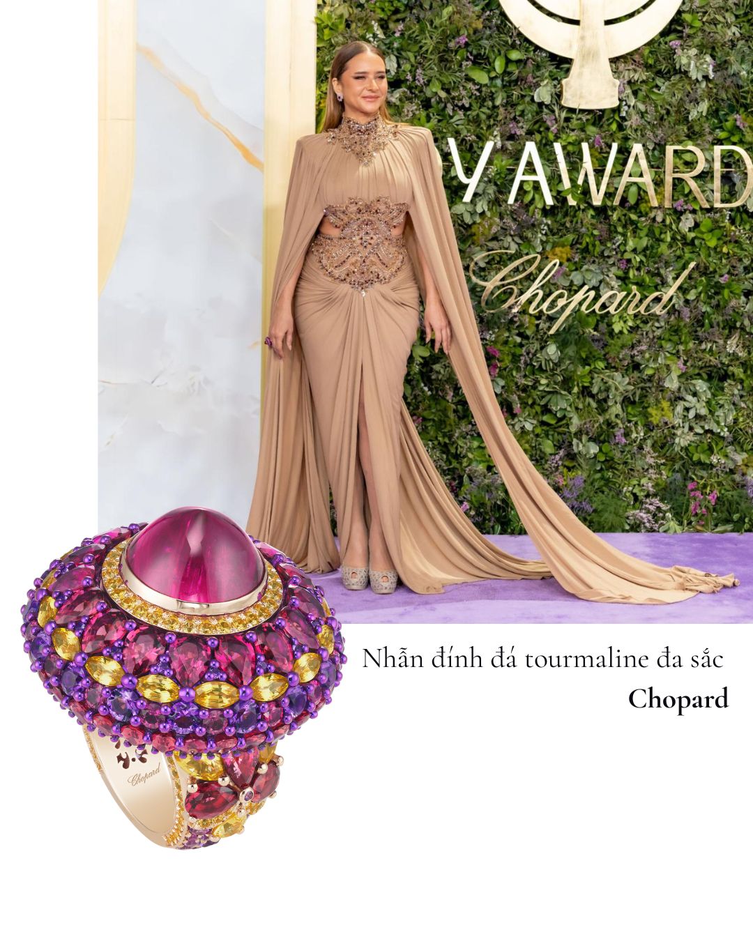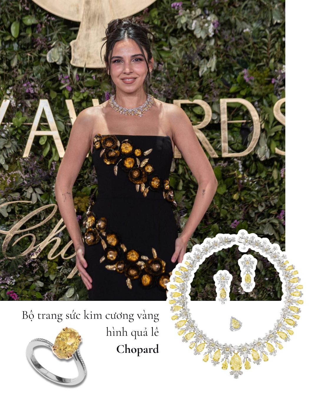 Được xướng tên ở hạng mục Personality of the Year (Nhân vật của năm), Millie Bobby Brown ghi điểm với bộ trang sức Haute Joaillerie gồm hoa tai kim cương hình quả lê cắt giác brilliant cùng các thiết kế nhẫn vàng trắng 18K phối hợp nhiều giác cắt. Tổng thể mang lại cảm giác trẻ trung, hiện đại cho ngôi sao Stranger Things, nhưng vẫn giữ được tinh thần sang trọng đặc trưng của Chopard.