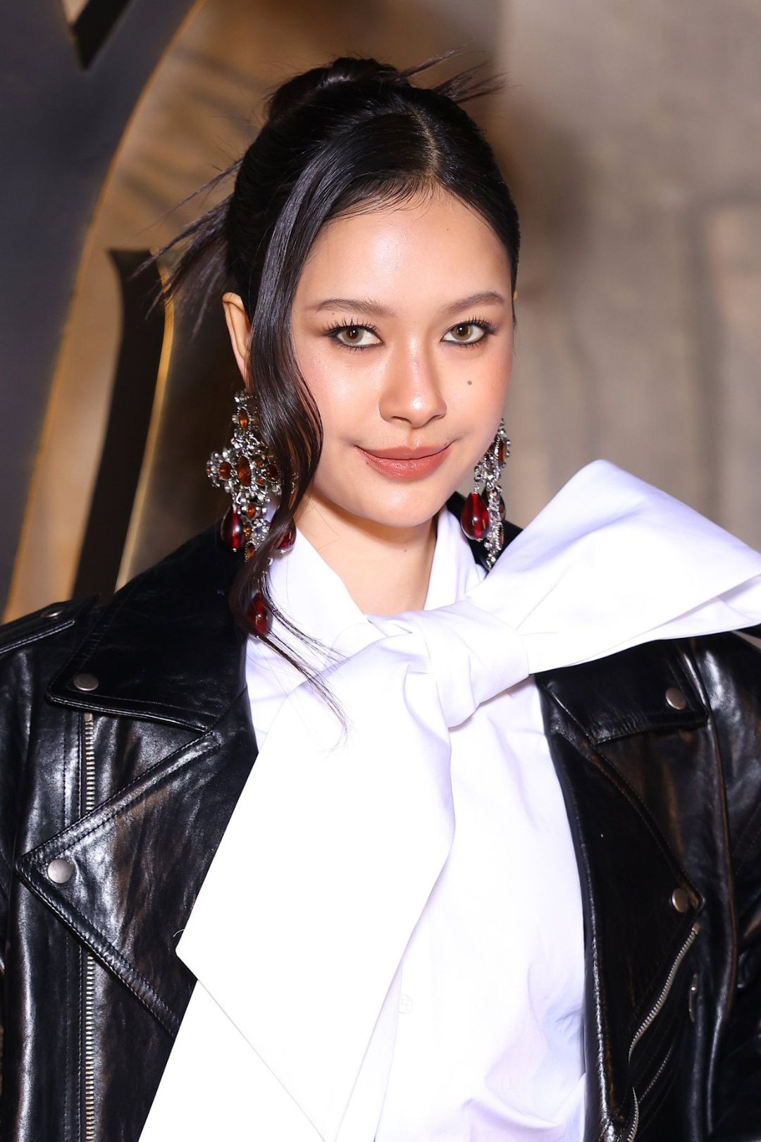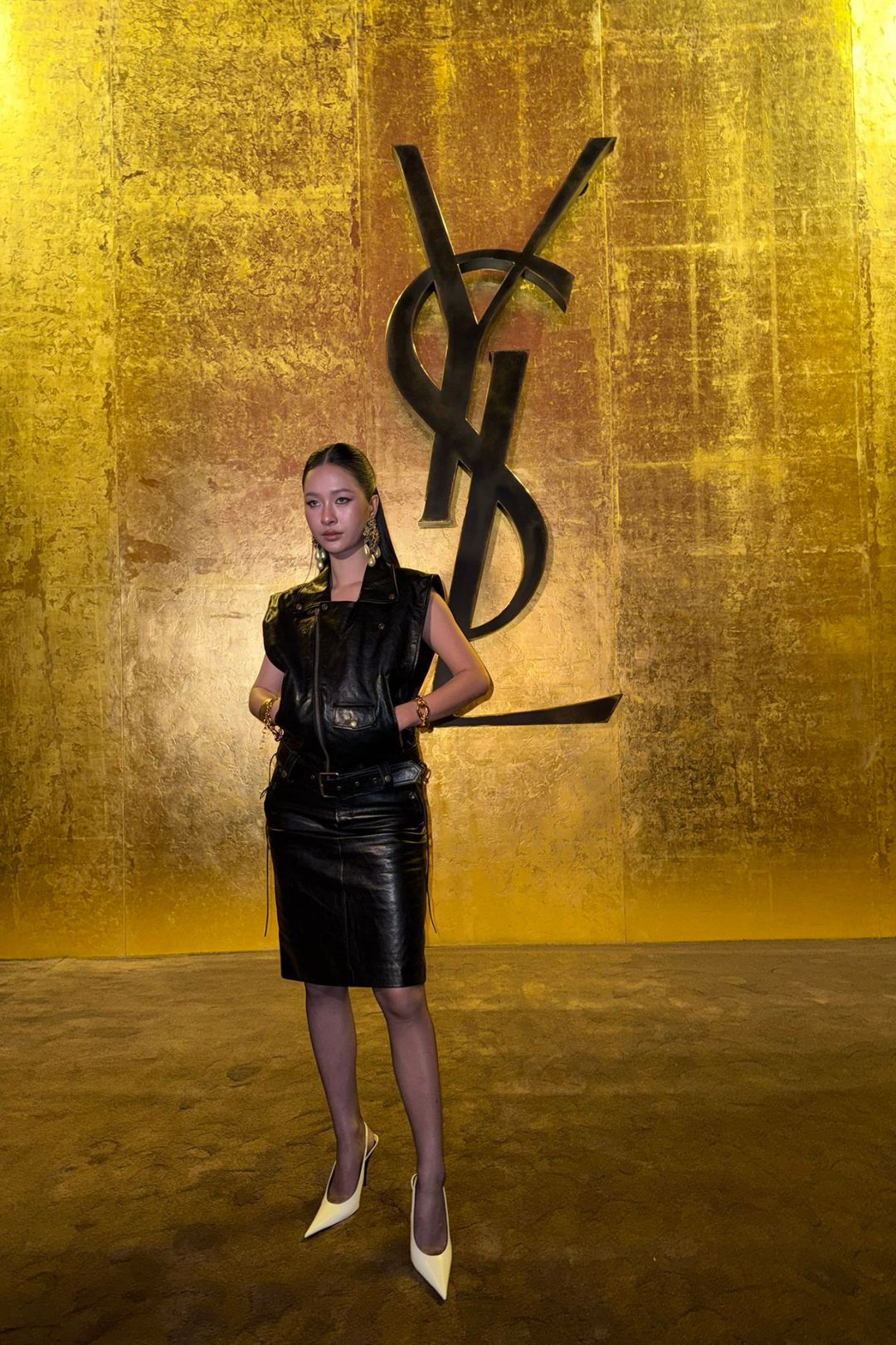 Để thấy được sự nhất quán của Milk, chúng ta cần nhìn lại màn chào sân của cô tại show diễn nam hồi tháng Giêng. Nếu show tháng Ba là sự sang trọng nữ tính, thì tháng Giêng chính là sự nổi loạn, cá tính và không thỏa hiệp – một khởi đầu đầy ấn tượng cho hành trình của cô với Saint Laurent. Bộ cánh lúc đó tập trung hoàn toàn vào sự thô mộc của chất liệu da. Milk Pansa diện áo áo khoác da dạng vest sát nách với các chi tiết khóa kéo kim loại hầm hố, kết hợp cùng chân váy da và thắt lưng bản lớn. Điểm nhấn là đôi hoa tai ngọc trai giọt nước cỡ đại và lối trang điểm sắc lạnh.