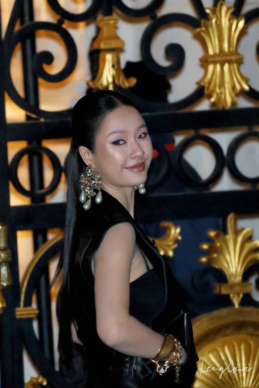 Chân váy bút chì ôm sát tôn lên vóc dáng thanh mảnh của Milk Pansa, kết hợp cùng chiếc thắt lưng da bản lớn tạo điểm nhấn vòng eo và kéo dài đôi chân. Đôi giày cao gót P.A.R.I.S Slingback Pumps màu trắng nổi bật giữa tổng thể đen, cùng đôi hoa tai hình thánh giá đính đá mang hơi hướng gothic.